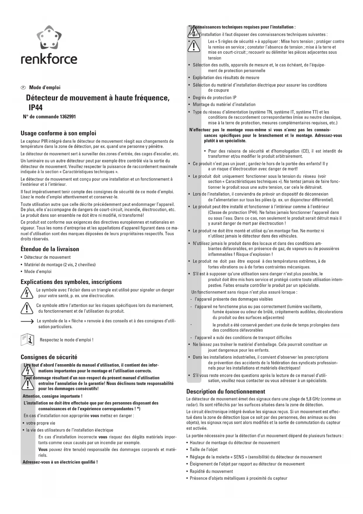 1362991 - Détecteur de mouvements Renkforce - Notice d'utilisation et mode d'emploi gratuit