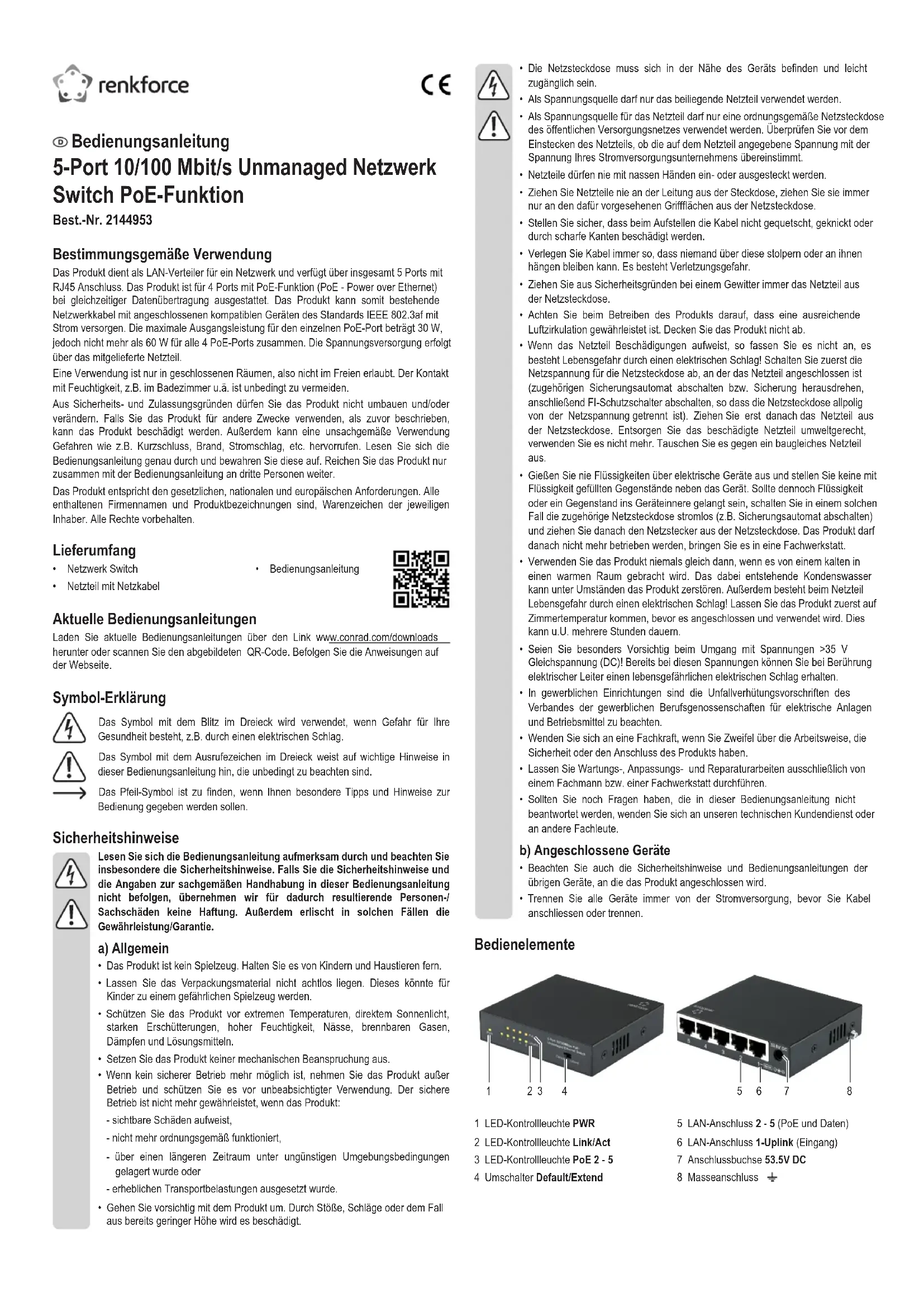 1 Témoin LED PWR 2 Témoin LED Link/Act 3 Témoin LED PoE 2 - 5 4 Commutateur Default/Extend 5 Port LAN 2 - 5 (PoE et données) 6 Port LAN 1-Uplink (entrée) 7 Douille de raccordement 53.5 V DC 8 Connecteur à la masse Mode d’emploi Commutateur réseau non administré à 5 ports 10/100 Mb/s avec fonctionnalité PoE N° de commande 2144953 Utilisation prévue Ce produit sert de distributeur de réseau LAN et est équipé de 5 ports au total avec connecteur RJ45. Ce produit est équipé de 4 ports avec fonctionnalité PoE (Power over Ethernet) pour la transmission simultanée des données. Le produit peut ainsi alimenter un câble réseau existant et des appareils compatibles connectés selon la norme IEEE 802.3af. La puissance de sortie maximale de chaque port PoE est de 30 W. Toutefois, la puissance totale des 4 ports PoE ne doit pas dépasser 60 W. L’alimentation électrique s'effectue au moyen du bloc d’alimentation fourni. L’utilisation est uniquement autorisée en intérieur, dans des locaux fermés ; l’utilisation en plein air est interdite. Évitez impérativement tout contact avec l’humidité, par ex. dans la salle de bain, etc. Pour des raisons de sécurité et d’homologation, toute transformation et/ou modication du produit est interdite. Si vous utilisez le produit à d’autres ns que celles décrites précédemment, vous risquez de l’endommager. Par ailleurs, une utilisation incorrecte peut être source de dangers tels que court-circuit, incendie, électrocution. Lisez attentivement le mode d’emploi et conservez-le. Ne donnez le produit à un tiers qu’accompagné de son mode d’emploi. Le produit est conforme aux exigences légales européennes et nationales en vigueur. Tous les noms d’entreprises et toutes les appellations de produits indiqués sont des marques déposées de leurs propriétaires respectifs. Tous droits réservés. Contenu d’emballage