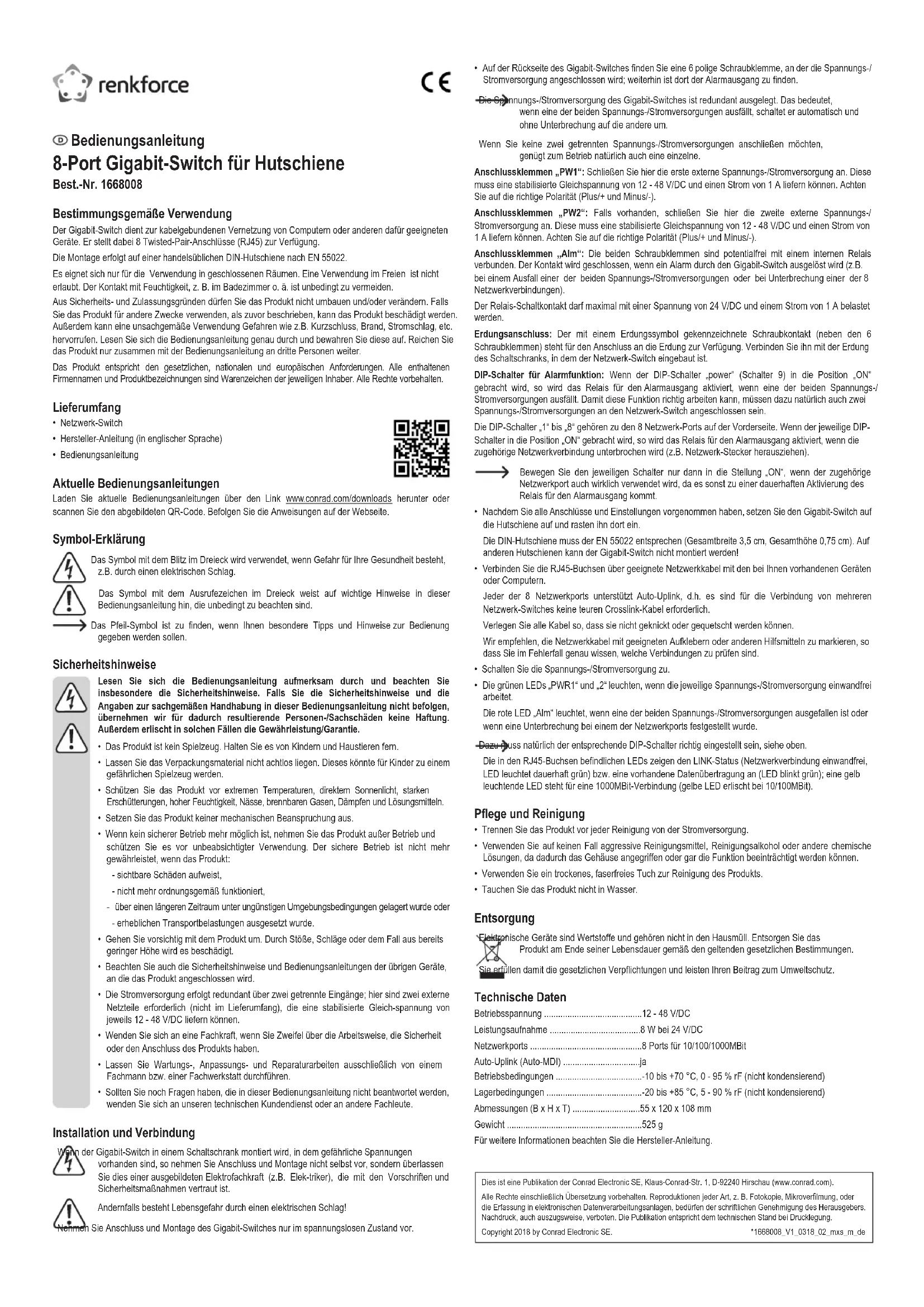 - Ne plongez pas le produit dans l’eau. Élimination des déchets Les appareils électroniques sont des matériaux recyclables et ne doivent pas être éliminés avec les ordures ménagères. En n de vie, éliminez l’appareil conformément aux dispositions légales en vigueur. Vous respectez ainsi les ordonnances légales et contribuez à la protection de l’environnement. Caractéristiques techniques Tension de service .........................................12 - 48 V / DC Consommation électrique ..............................8 W à 24 V/DC Ports réseau ..................................................8 ports pour 10/100/1000 MBits Auto-uplink (auto MDI) ...................................oui Conditions de fonctionnement ....................... -10 à +70 °C, 0 à 95 % HR (sans condensation) Conditions de stockage .................................-20 à +85 °C, 5 - 90 % humidité rélative (sans condensation) Dimensions (L x H x P) .................................. 55 x 120 x 108 mm Poids ..............................................................525 g Pour de plus amples informations, se référer aux instructions du fabricant. Mode d’emploi Commutaeur Gigabit à 8 ports pour montage sur rails Nº de commande : 1668008 Utilisation prévue Le commutateur Gigabit sert à l’interconnexion par câbles d’ordinateur ou d’autres appareils appropriés. A cet effet, il met à disposition 8 raccords à paires torsadées (RJ45). Le montage s’effectue sur un rail DIN standard conformément à la norme EN 55022. Il est uniquement prévu pour une utilisation en intérieur. L’utilisation en plein air est interdite. Évitez impérativement tout contact avec l’humidité, par ex. dans la salle de bains, etc. Pour des raisons de sécurité et d’homologation, toute transformation et/ou modication du produit est interdite. Toute utilisation autre que celle décrite précédemment risque d’endommager le produit. Par ailleurs, une utilisation incorrecte peut être source de dangers tels que les courts-circuits, les incendies, l’électrocution. Lisez attentivement le mode d’emploi et conservez-le. Ne transmettez le produit à des tiers qu’accompagné de son mode d’emploi. Le produit est conforme aux exigences des directives européennes et nationales en vigueur. Tous les noms d’entreprises et appellations de produits contenus dans ce mode d’emploi sont des marques déposées de leurs propriétaires respectifs. Tous droits réservés. Contenu d’emballage