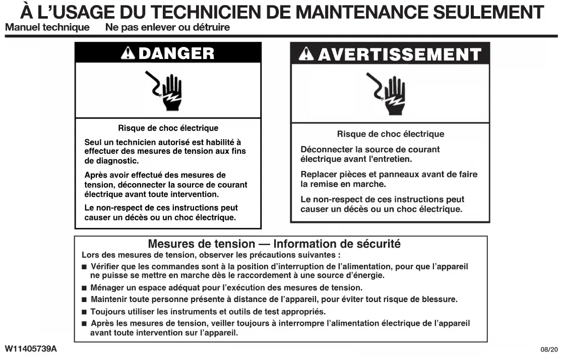 DO NOT REMOVE OR DESTROYÀ L’USAGE DU TECHNICIEN DE MAINTENANCE SEULEMENT Manuel technique Ne pas enlever ou détruire W11405739A08/20 AVERTISSEMENT Risque de choc électriqueDéconnecter la source de courant électrique avant l'entretien.Replacer pièces et panneaux avant de faire la remise en marche.Le non-respect de ces instructions peut causer un décès ou un choc électrique. DANGER Risque de choc électriqueSeul un technicien autorisé est habilité à effectuer des mesures de tension aux fins de diagnostic.Après avoir effectué des mesures de tension, déconnecter la source de courant électrique avant toute intervention.Le non-respect de ces instructions peut causer un décès ou un choc électrique. Mesures de tension — Information de sécurité Lors des mesures de tension, observer les précautions suivantes : ■ Vérifier que les commandes sont à la position d’interruption de l’alimentation, pour que l’appareil ne puisse se mettre en marche dès le raccordement à une source d’énergie.■ Ménager un espace adéquat pour l’exécution des mesures de tension. ■ Maintenir toute personne présente à distance de l’appareil, pour éviter tout risque de blessure. ■ Toujours utiliser les instruments et outils de test appropriés. ■ Après les mesures de tension, veiller toujours à interrompre l’alimentation électrique de l’appareil avant toute intervention sur l’appareil.À L’USAGE DU TECHNICIEN DE MAINTENANCE SEULEMENT