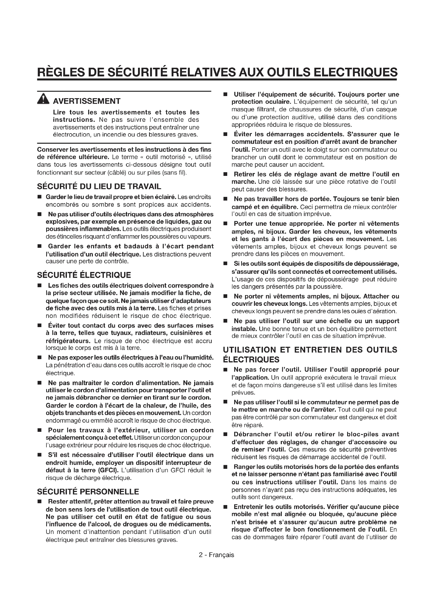 - arsenic and chromium from chemically treated lumber. Your risk from exposure to these chemicals varies, depending on how often you do this type of work. To reduce your exposure, work in a well-ventilated area and with approved safety equipment, such as dust masks that are specially designed to filter out microscopic particles.2 - Français AVERTISSEMENT Lire tous les avertissements et toutes les instructions. Ne pas suivre l’ensemble des avertissements et des instructions peut entraîner une électrocution, un incendie ou des blessures graves. Conserver les avertissements et les instructions à des fins de référence ultérieure. Le terme « outil motorisé », utilisé dans tous les avertissements ci-dessous désigne tout outil fonctionnant sur secteur (câblé) ou sur piles (sans fil).