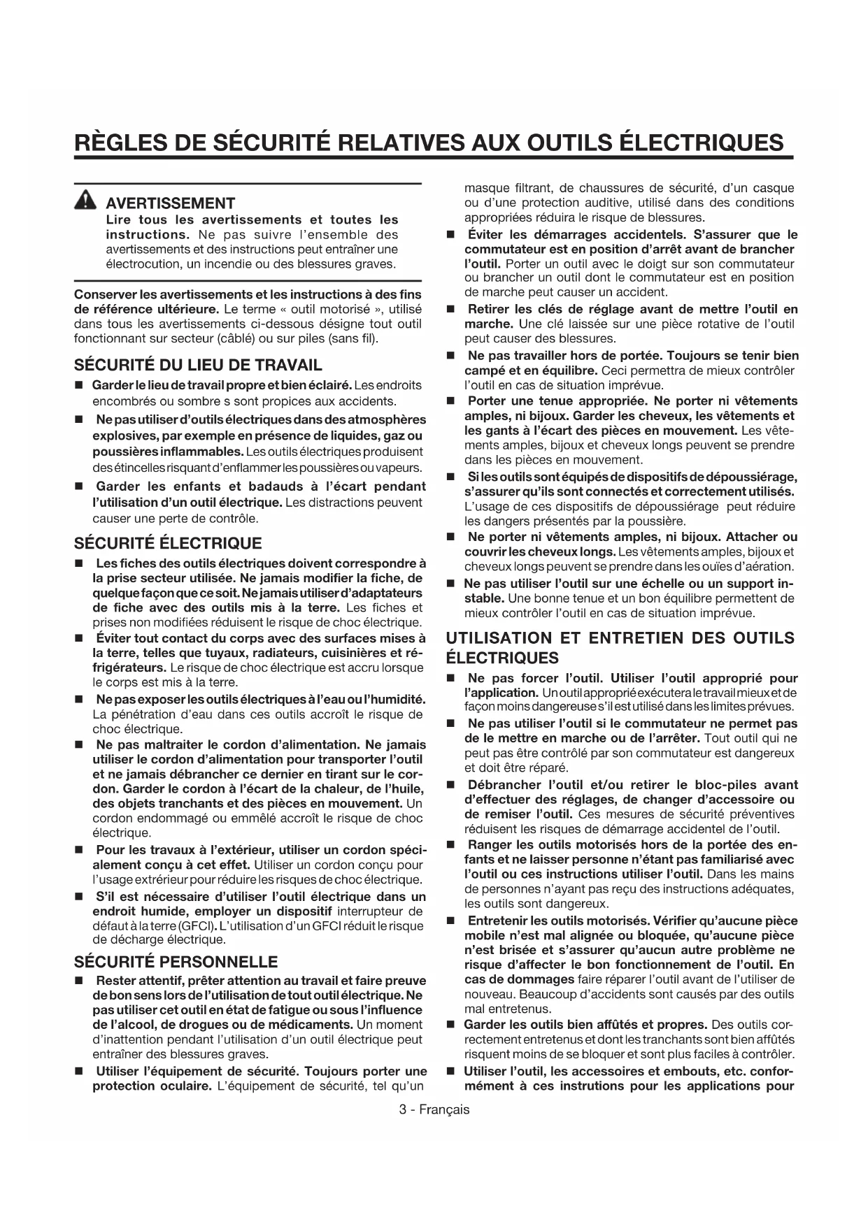 RÈGLES DE SÉCURITÉ RELATIVES AUX OUTILS ÉLECTRIQUES lesquelles ils sont conçus, en tenant compte des condi- tions et du type de travail à exécuter. L’usage d’un outil motorisé pour des applications pour lesquelles il n’est pas conçu peut être dangereux. DÉPANNAGE Les réparat ions doivent être confiées à un technicien qual- ifié, utilisant exclusivement des pièces identiques à celles d’origine. Ceci assurera le maintien de la sécurité de l’outil. Utiliser exclusivement des pièces identiques à celles d’origine pour les réparations. Se conformer aux instruc- tions de la section Entretien de ce manuel. L’usage de pièces non autorisées ou le non-respect des instructions peut présenter des risques de choc électrique ou de blessures.5 - Français SYMBOLES Certains des symboles ci-dessous peuvent être utilisés sur produit. Veiller à les étudier et à apprendre leur signification. Une interprétation correcte de ces symboles permettra d’utiliser produit plus efficacement et de réduire les risques.