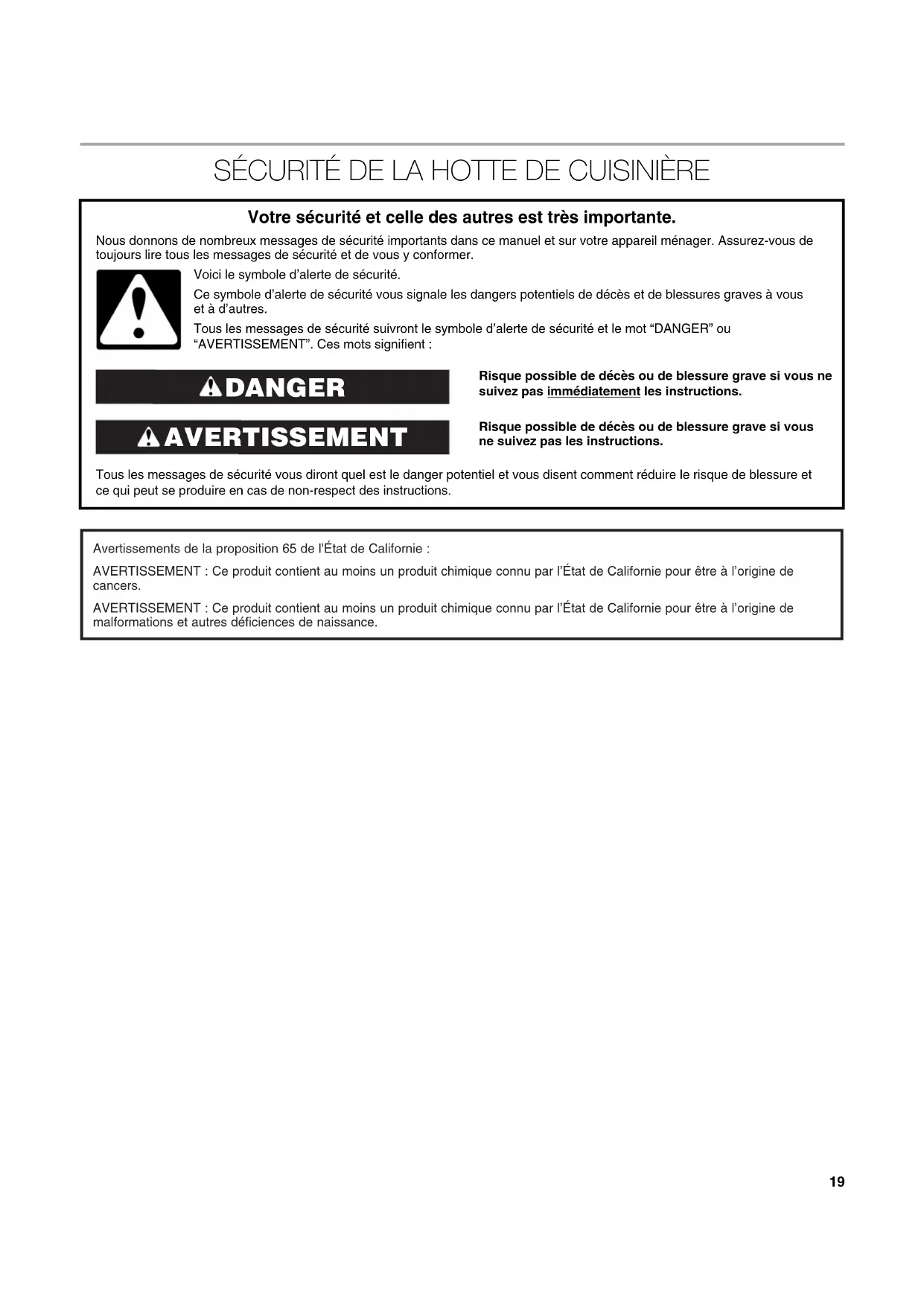 Jenn-Air makes no representations about the quality, durability, or need for service or repair of this major appliance other than the representations contained in this warranty. If you want a longer or more comprehensive warranty than the limited warranty that comes with this major appliance, you should ask Jenn-Air or your retailer about buying an extended warranty. LIMITATION OF REMEDIES; EXCLUSION OF INCIDENTAL AND CONSEQUENTIAL DAMAGES YOUR SOLE AND EXCLUSIVE REMEDY UNDER THIS LIMITED WARRANTY SHALL BE PRODUCT REPAIR AS PROVIDED HEREIN. JENN-AIR SHALL NOT BE LIABLE FOR INCIDENTAL OR CONSEQUENTIAL DAMAGES. Some states and provinces do not allow the exclusion or limitation of incidental or consequential damages, so these limitations and exclusions may not apply to you. This warranty gives you specific legal rights, and you also may have other rights that vary from state to state or province to province.19 SÉCURITÉ DE LA HOTTE DE CUISINIÈRE Risque possible de décès ou de blessure grave si vous ne suivez pas immédiatement les instructions. Risque possible de décès ou de blessure grave si vous ne suivez pas les instructions. Tous les messages de sécurité vous diront quel est le danger potentiel et vous disent comment réduire le risque de blessure et ce qui peut se produire en cas de non-respect des instructions. Votre sécurité et celle des autres est très importante. Nous donnons de nombreux messages de sécurité importants dans ce manuel et sur votre appareil ménager. Assurez-vous de toujours lire tous les messages de sécurité et de vous y conformer. AVERTISSEMENT DANGER Voici le symbole d’alerte de sécurité. Ce symbole d’alerte de sécurité vous signale les dangers potentiels de décès et de blessures graves à vous et à d’autres. Tous les messages de sécurité suivront le symbole d’alerte de sécurité et le mot “DANGER” ou “AVERTISSEMENT”. Ces mots signifient : Avertissements de la proposition 65 de l'État de Californie :