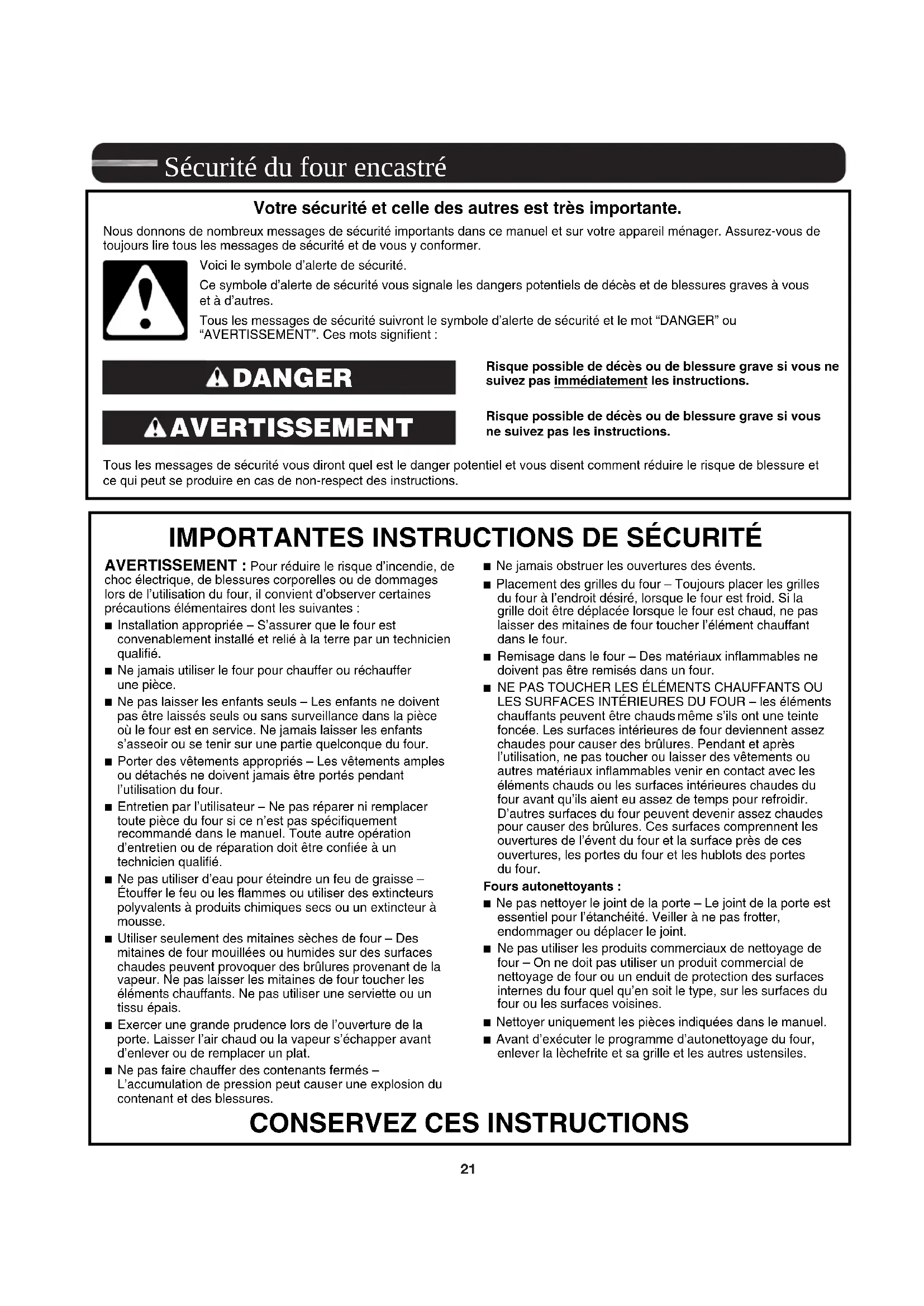 AVERTISSEMENT : Pour réduire le risque d’incendie, de choc électrique, de blessures corporelles ou de dommages lors de l’utilisation du four, il convient d’observer certaines précautions élémentaires dont les suivantes :■ Installation appropriée – S’assurer que le four est convenablement installé et relié à la terre par un technicien qualifié.■ Ne jamais utiliser le four pour chauffer ou réchauffer une pièce. Ne pas laisser les enfants seuls – Les enfants ne doivent pas être laissés seuls ou sans surveillance dans la pièce où le four est en service. Ne jamais laisser les enfants s’asseoir ou se tenir sur une partie quelconque du four.■ Porter des vêtements appropriés – Les vêtements amples ou détachés ne doivent jamais être portés pendant l’utilisation du four.■ Entretien par l’utilisateur – Ne pas réparer ni remplacer toute pièce du four si ce n’est pas spécifiquement recommandé dans le manuel. Toute autre opération d’entretien ou de réparation doit être confiée à un technicien qualifié.■ Ne pas utiliser d’eau pour éteindre un feu de graisse – Étouffer le feu ou les flammes ou utiliser des extincteurs polyvalents à produits chimiques secs ou un extincteur à mousse.■ Utiliser seulement des mitaines sèches de four – Des mitaines de four mouillées ou humides sur des surfaces chaudes peuvent provoquer des brûlures provenant de la vapeur. Ne pas laisser les mitaines de four toucher les éléments chauffants. Ne pas utiliser une serviette ou un tissu épais.■ Exercer une grande prudence lors de l’ouverture de la porte. Laisser l’air chaud ou la vapeur s’échapper avant d’enlever ou de remplacer un plat. Ne pas faire chauffer des contenants fermés – L’accumulation de pression peut causer une explosion du contenant et des blessures.■ Ne jamais obstruer les ouvertures des évents.■ Placement des grilles du four – Toujours placer les grilles du four à l’endroit désiré, lorsque le four est froid. Si la grille doit être déplacée lorsque le four est chaud, ne pas laisser des mitaines de four toucher l’élément chauffant dans le four. Remisage dans le four – Des matériaux inflammables ne doivent pas être remisés dans un four. NE PAS TOUCHER LES ÉLÉMENTS CHAUFFANTS OU LES SURFACES INTÉRIEURES DU FOUR – les éléments chauffants peuvent être chauds même s’ils ont une teinte foncée. Les surfaces intérieures de four deviennent assez chaudes pour causer des brûlures. Pendant et après l’utilisation, ne pas toucher ou laisser des vêtements ou autres matériaux inflammables venir en contact avec les éléments chauds ou les surfaces intérieures chaudes du four avant qu’ils aient eu assez de temps pour refroidir. D’autres surfaces du four peuvent devenir assez chaudes pour causer des brûlures. Ces surfaces comprennent les ouvertures de l’évent du four et la surface près de ces ouvertures, les portes du four et les hublots des portes du four.Fours autonettoyants : ■ Ne pas nettoyer le joint de la porte – Le joint de la porte est essentiel pour l’étanchéité. Veiller à ne pas frotter, endommager ou déplacer le joint. Ne pas utiliser les produits commerciaux de nettoyage de four – On ne doit pas utiliser un produit commercial de nettoyage de four ou un enduit de protection des surfaces internes du four quel qu’en soit le type, sur les surfaces du four ou les surfaces voisines. ■ Nettoyer uniquement les pièces indiquées dans le manuel.■ Avant d’exécuter le programme d’autonettoyage du four, enlever la lèchefrite et sa grille et les autres ustensiles.22 Ce manuel concerne plusieurs modèles. Le modèle que vous avez peut comporter toutes les caractéristiques énumérées ou seulement certaines d’entre elles. Se reporter à ce manuel ou à la section Foire Aux Questions (FAQ) de notre site Web sur www.jennair.com pour des instructions plus détaillées. Au Canada, consulter la section du service à la clientèle sur www.jennair.ca.