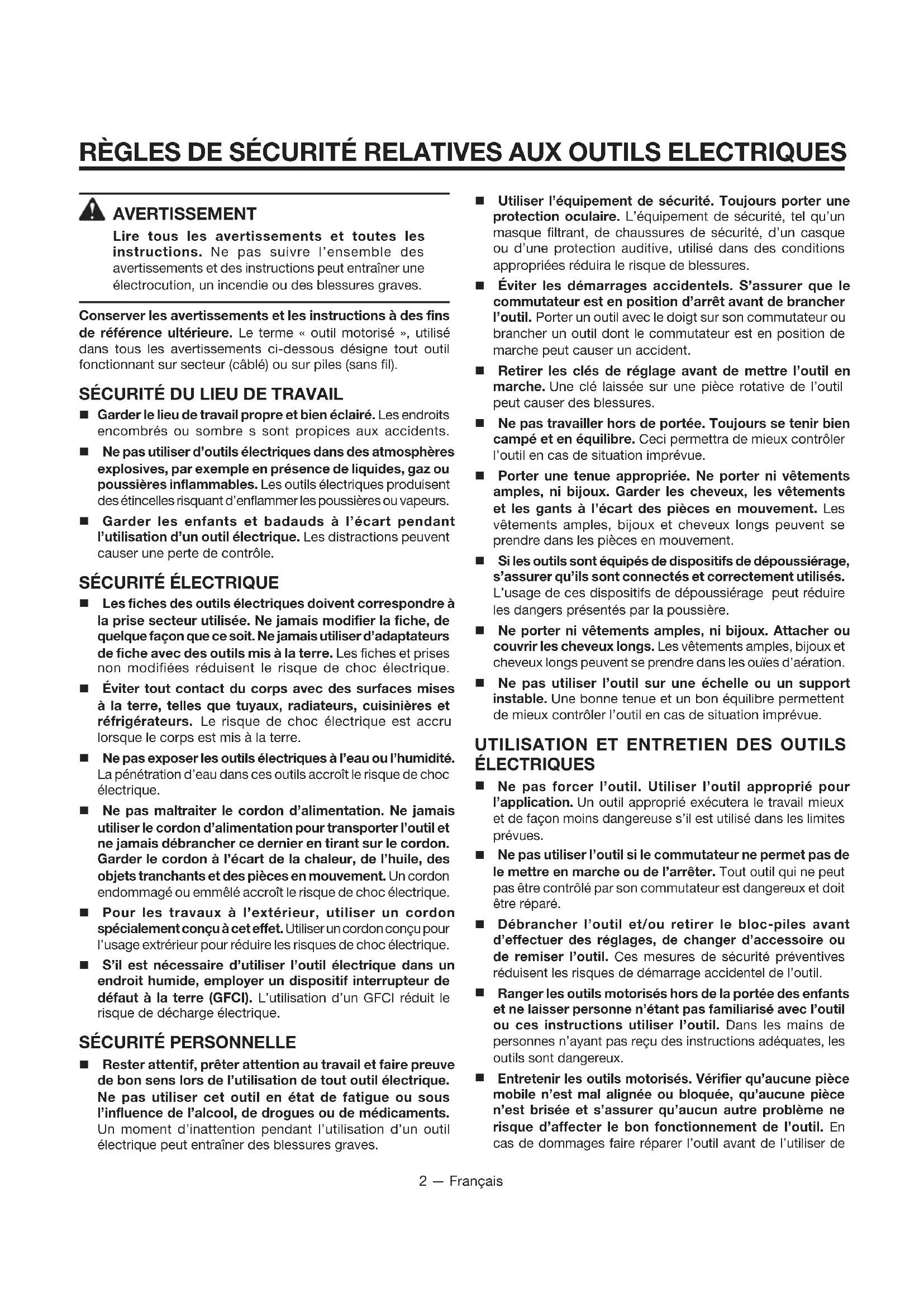 Entretenir les outils motorisés. Vérifier qu’aucune pièce mobile n’est mal alignée ou bloquée, qu’aucune pièce n’est brisée et s’assurer qu’aucun autre problème ne risque d’affecter le bon fonctionnement de l’outil. En cas de dommages faire réparer l’outil avant de l’utiliser de RÈGLES DE SÉCURITÉ RELATIVES AUX OUTILS ELECTRIQUES3 — Français nouveau. Beaucoup d’accidents sont causés par des outils mal entretenus.