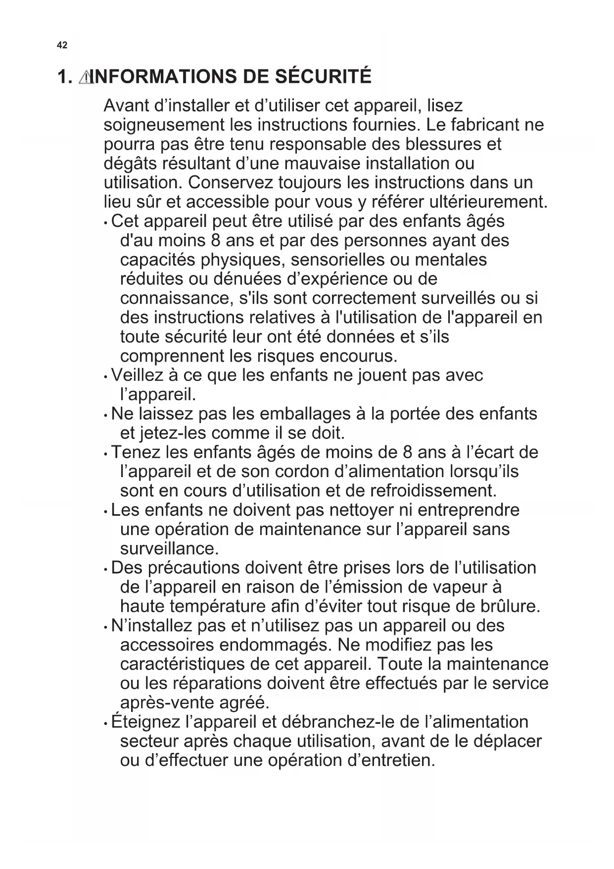 - Cet appareil peut être utilisé par des enfants âgés d'au moins 8 ans et par des personnes ayant des capacités physiques, sensorielles ou mentales réduites ou dénuées d’expérience ou de connaissance, s'ils sont correctement surveillés ou si des instructions relatives à l'utilisation de l'appareil en toute sécurité leur ont été données et s’ils comprennent les risques encourus.