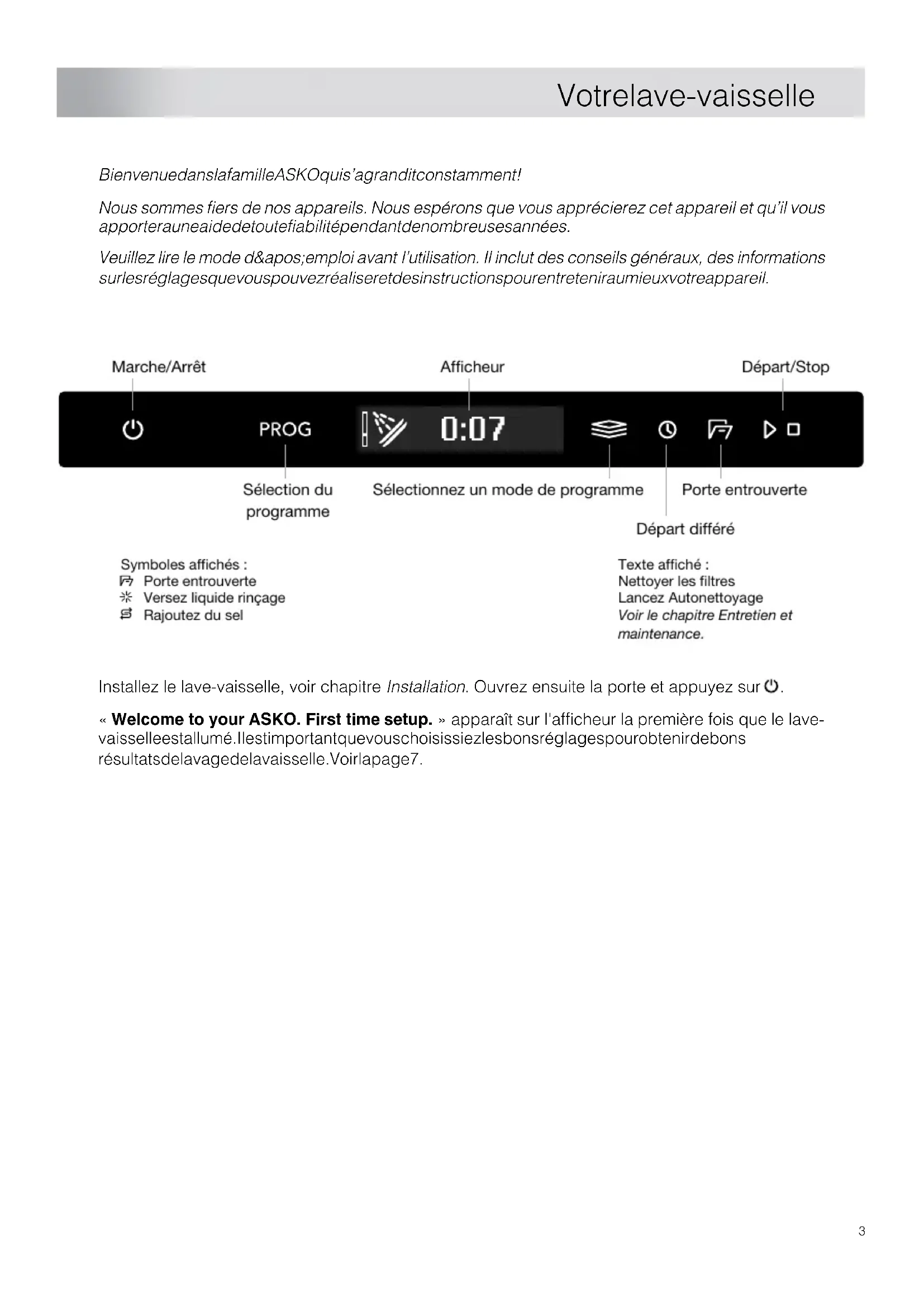 Données techniques et performances énergétiques ............................................... 42Données techniques .................................... 42Informations pour les consommateurs ........ 42Informations pour le laboratoire d’essais ..... Tables des matièresBienvenue dans la famille ASKO qui s’agrandit constamment ! Nous sommes fiers de nos appareils. Nous espérons que vous apprécierez cet appareil et qu’il vous apportera une aide de toute fiabilité pendant de nombreuses années. Veuillez lire le mode d'emploi avant l’utilisation. Il inclut des conseils généraux, des informations sur les réglages que vous pouvez réaliser et des instructions pour entretenir au mieux votre appareil. Afficheur Départ/Stop Sélectionnez un mode de programmeSélection du programme Porte entrouverte Départ différé Marche/Arrêt Rajoutez du sel Versez liquide rinçage Porte entrouverte Symboles affichés: Texte affiché: Nettoyer les filtres Lancez Autonettoyage Voir le chapitre Entretien et maintenance. Installez le lave-vaisselle, voir chapitre Installation. Ouvrez ensuite la porte et appuyez sur . « Welcome to your ASKO. First time setup. » apparaît sur l'afficheur la première fois que le lave- vaisselle est allumé. Il est important que vous choisissiez les bons réglages pour obtenir de bons résultats de lavage de la vaisselle. Voir la page 7.
