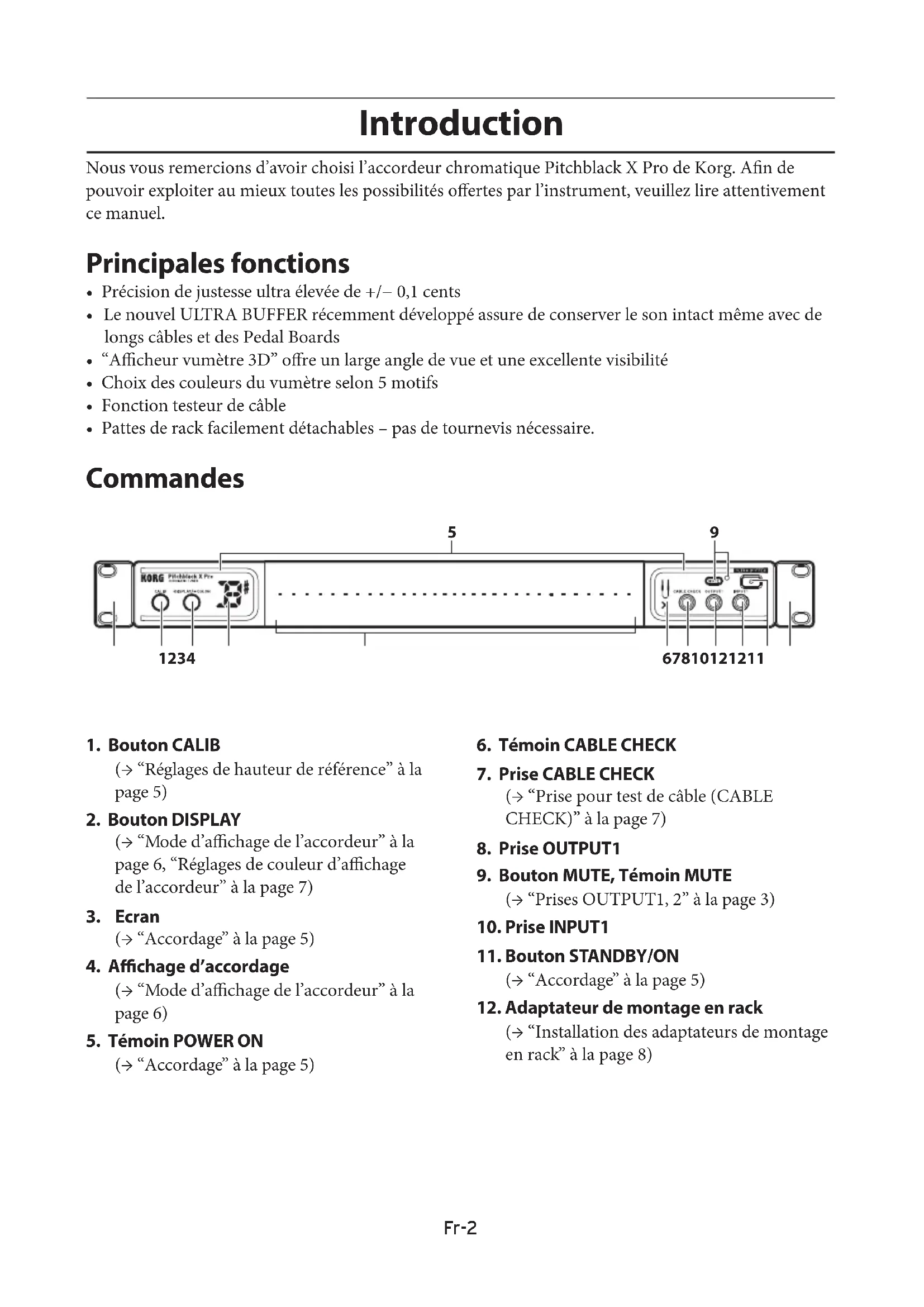 - Tous les noms de produits et de sociétés sont des marques commerciales ou déposées de leur détenteur respectif.Fr-2 Introduction Nous vous remercions d’avoir choisi l’accordeur chromatique Pitchblack X Pro de Korg. An de pouvoir exploiter au mieux toutes les possibilités oertes par l’instrument, veuillez lire attentivement ce manuel. Principales fonctions