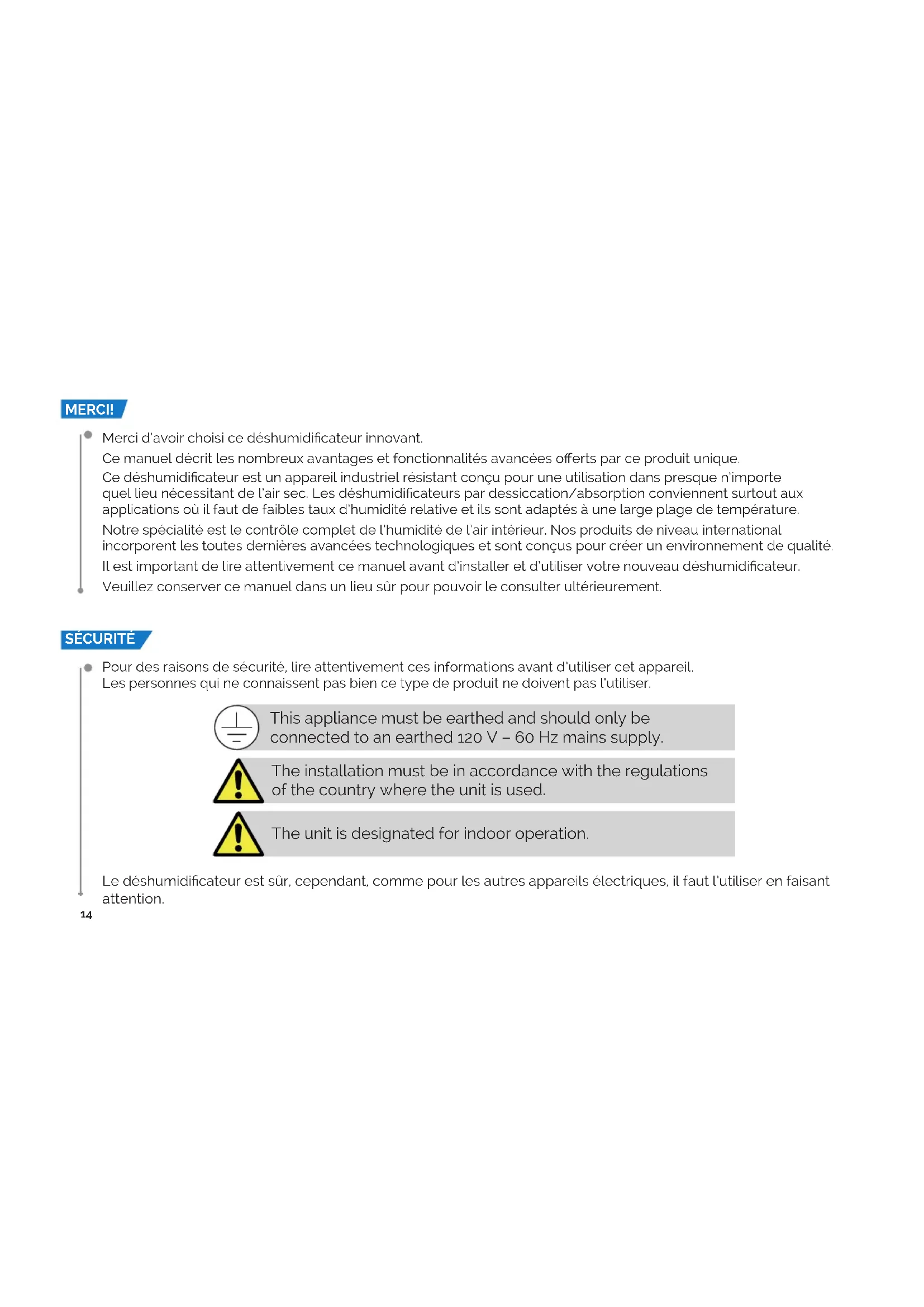 Merci d’avoir choisi ce déshumidicateur innovant. Ce manuel décrit les nombreux avantages et fonctionnalités avancées oerts par ce produit unique. Ce déshumidicateur est un appareil industriel résistant conçu pour une utilisation dans presque n’importe quel lieu nécessitant de l’air sec. Les déshumidicateurs par dessiccation/absorption conviennent surtout aux applications où il faut de faibles taux d’humidité relative et ils sont adaptés à une large plage de température. Notre spécialité est le contrôle complet de l’humidité de l’air intérieur. Nos produits de niveau international incorporent les toutes dernières avancées technologiques et sont conçus pour créer un environnement de qualité. Il est important de lire attentivement ce manuel avant d’installer et d’utiliser votre nouveau déshumidicateur. Veuillez conserver ce manuel dans un lieu sûr pour pouvoir le consulter ultérieurement. MERCI! | SÉCURITÉ |15
