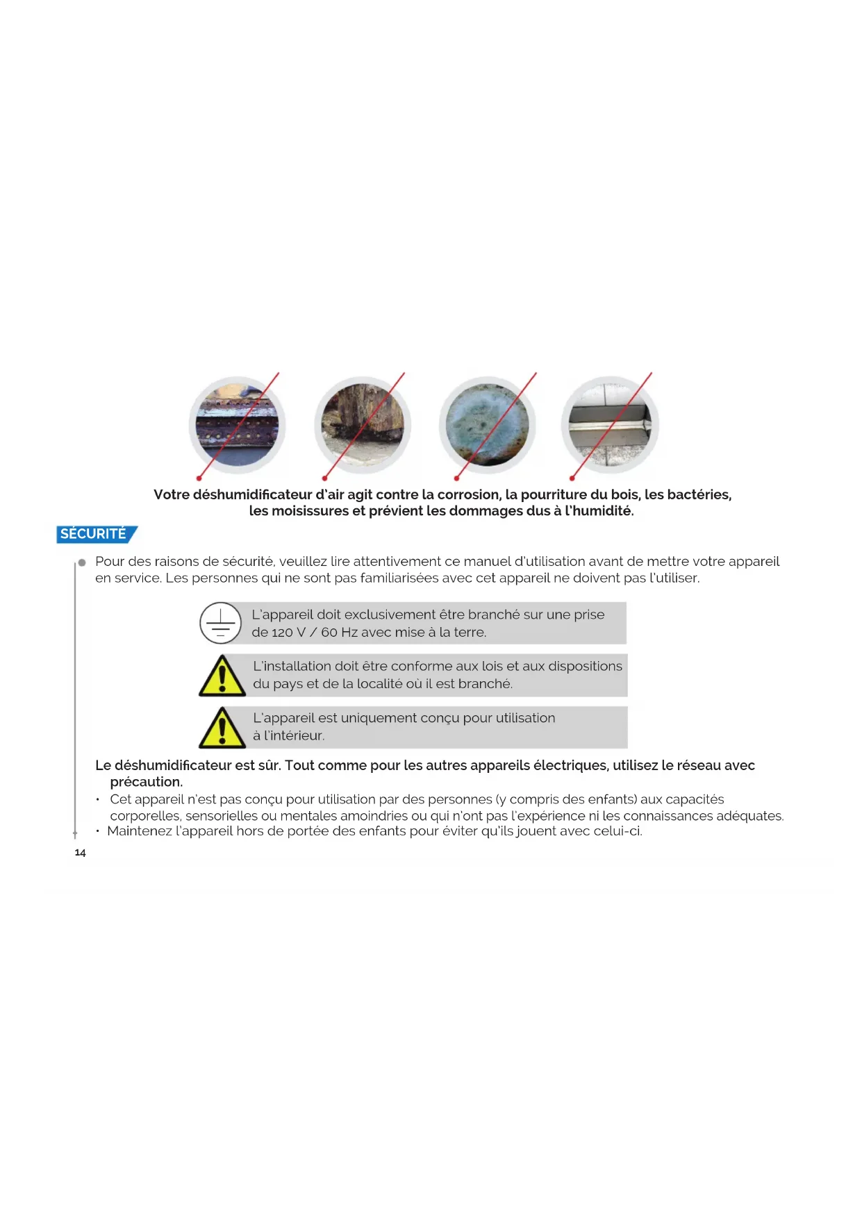 - Blank replacement top plate without handle – pack of one14 Pour des raisons de sécurité, veuillez lire attentivement ce manuel d’utilisation avant de mettre votre appareil en service. Les personnes qui ne sont pas familiarisées avec cet appareil ne doivent pas l’utiliser. SÉCURITÉ | Le déshumidicateur est sûr. Tout comme pour les autres appareils électriques, utilisez le réseau avec précaution.