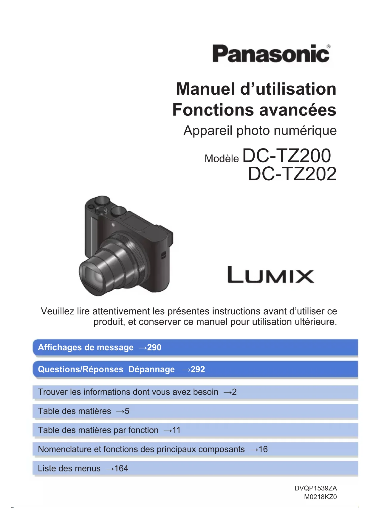 Manuel d’utilisation Fonctions avancées Appareil photo numérique Modèle DC-TZ200 DC-TZ202 DVQP1539ZAM0218KZ0Affichages de message →290 Veuillez lire attentivement les présentes instructions avant d’utiliser ce produit, et conserver ce manuel pour utilisation ultérieure. Questions/Réponses Dépannage →292Trouver les informations dont vous avez besoin →2Table des matières →5Table des matières par fonction →11Liste des menus →164Nomenclature et fonctions des principaux composants →162 Trouver les informations dont vous avez besoin Dans ce « Manuel d’utilisation Fonctions avancées », vous trouverez les informations dont vous avez besoin dans les pages suivantes. Cliquer sur un numéro de page vous permet de sauter jusqu’à la page liée et de rapidement trouver les informations. Recherche depuis « Table des matières »