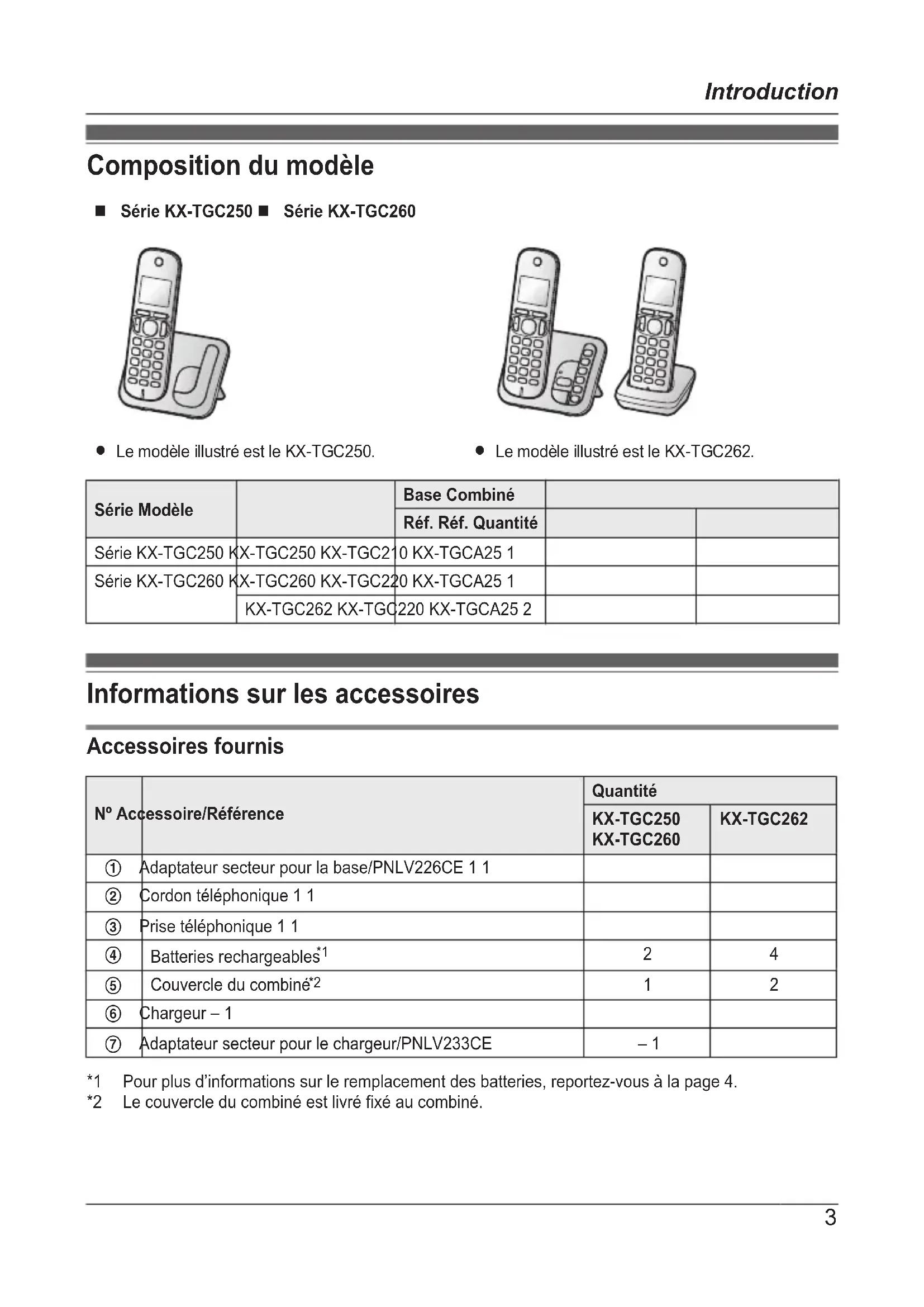 SommaireComposition du modèle n Série KX-TGC250 n Série KX-TGC260 R Le modèle illustré est le KX-TGC250. R Le modèle illustré est le KX-TGC262. Série Modèle Base Combiné Réf. Réf. Quantité Série KX-TGC250 KX-TGC250 KX-TGC210 KX-TGCA25 1 Série KX-TGC260 KX-TGC260 KX-TGC220 KX-TGCA25 1