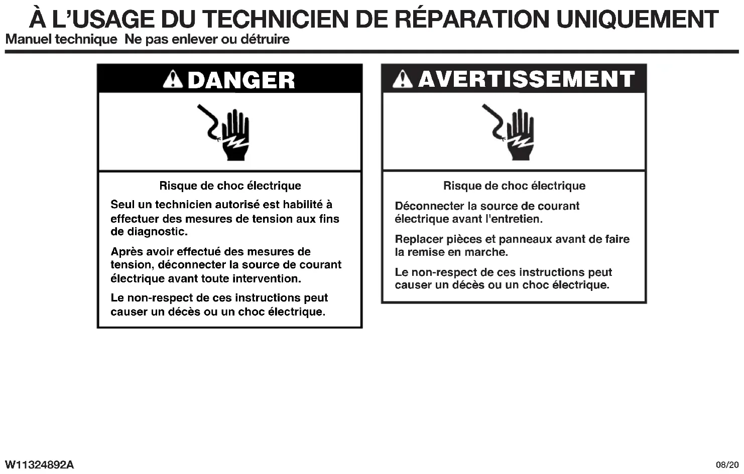 08/20 FOR SERVICE TECHNICIAN’S USE ONLYÀ L’USAGE DU TECHNICIEN DE RÉPARATION UNIQUEMENT Manuel technique Ne pas enlever ou détruire W11324892A08/20 AVERTISSEMENT Risque de choc électriqueDéconnecter la source de courant électrique avant l'entretien.Replacer pièces et panneaux avant de faire la remise en marche.Le non-respect de ces instructions peut causer un décès ou un choc électrique. DANGER Risque de choc électrique Seul un technicien autorisé est habilité à effectuer des mesures de tension aux fins de diagnostic. Après avoir effectué des mesures de tension, déconnecter la source de courant électrique avant toute intervention. Le non-respect de ces instructions peut causer un décès ou un choc électrique.28 À L’USAGE DU TECHNICIEN DE RÉPARATION UNIQUEMENT Mesures de tension - Information de sécurité Lors des mesures de tension, observer les précautions suivantes : ■ Vérifier que les commandes sont à la position d'arrêt afin que l'appareil ne se mette pas en marche lors de la mise sous tension. ■ Ménager un espace adéquat libre de toute obstruction pour l'exécution des mesures de tension. ■ Maintenir toute personne présente à distance de l'appareil pour éviter tout risque de blessure. ■ Toujours utiliser les instruments et outils de test appropriés. ■ Après les mesures de tension, veiller à toujours déconnecter la source de courant électrique avant toute intervention.29 IMPORTANT: Circuits électroniques sensibles aux décharges électrostatiques Le risque de décharge électrostatique est permanent. Une décharge électrostatique peut détruire ou détériorer les circuits électroniques de la machine. La nouvelle carte peut sembler fonctionner correctement après la réparation, mais une décharge électrostatique peut lui avoir fait subir des contraintes qui provoqueront une défaillance plus tard.