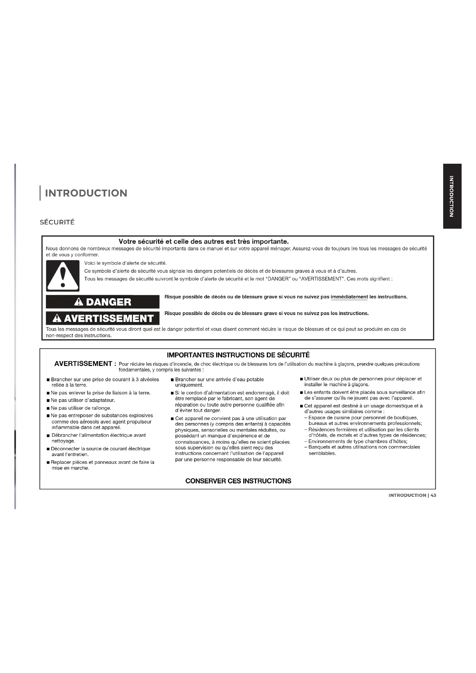 Pour réduire les risques d’incendie, de choc électrique ou de blessures lors de l’utilisation du machine à glaçons, prendre quelques précautions fondamentales, y compris les suivantes :