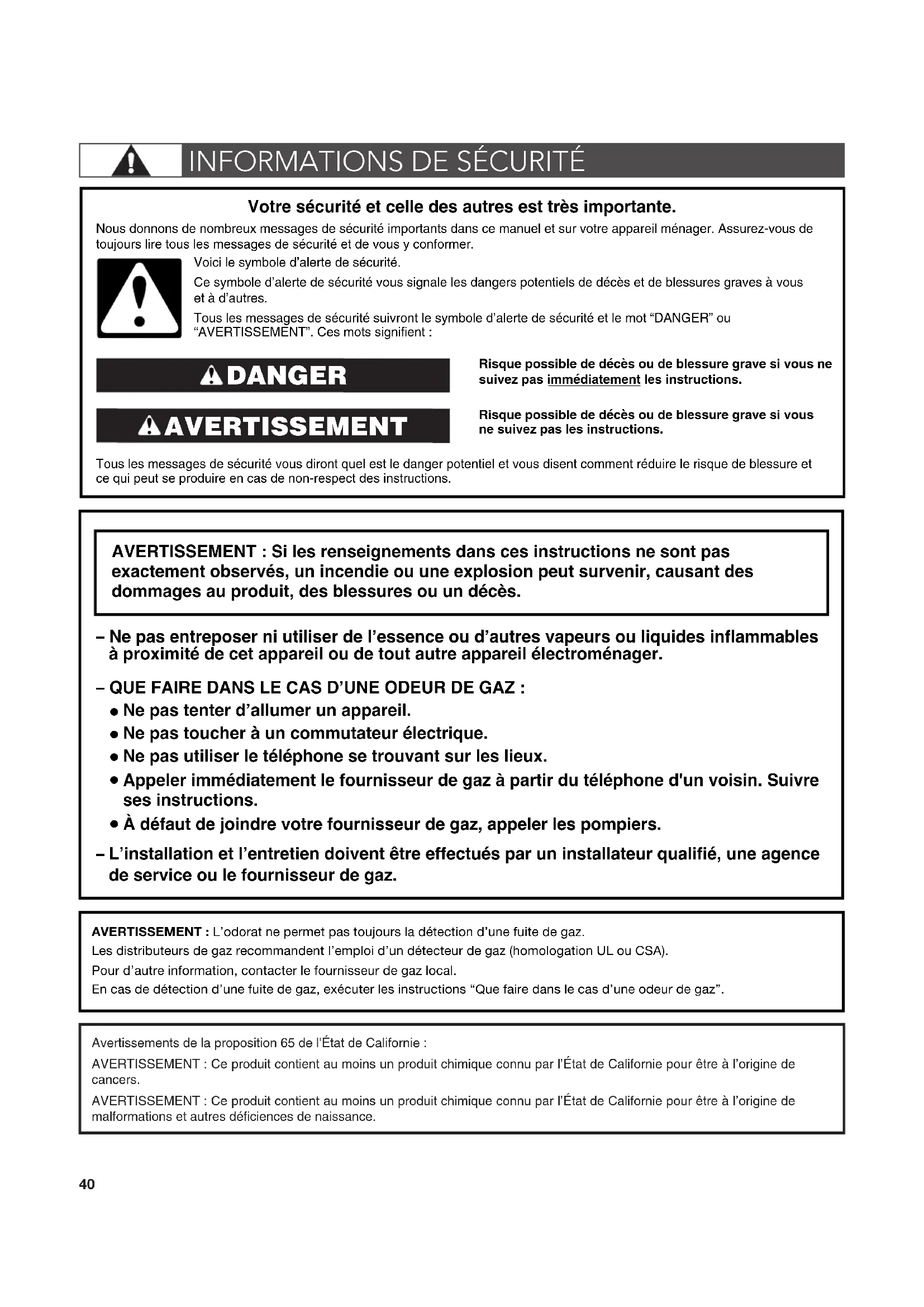 malformations et autres déficiences de naissance.AVERTISSEMENT : L’odorat ne permet pas toujours la détection d’une fuite de gaz.Les distributeurs de gaz recommandent l’emploi d’un détecteur de gaz (homologation UL ou CSA).Pour d’autre information, contacter le fournisseur de gaz local.En cas de détection d’une fuite de gaz, exécuter les instructions “Que faire dans le cas d’une odeur de gaz”.41