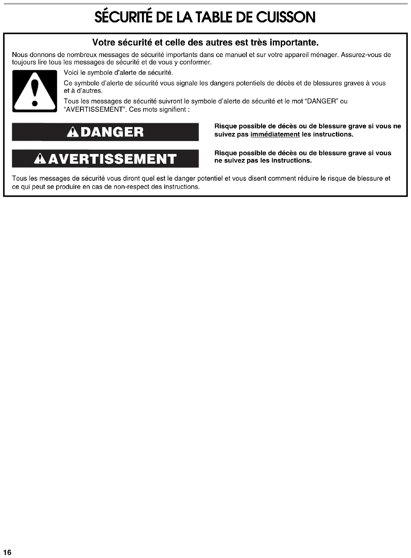Pour réduire le risque d'incendie, de choc électrique, de blessures ou de dommages lors de l'utilisation de la table de cuisson, observer les précautions élémentaires suivantes, y compris ce qui suit :