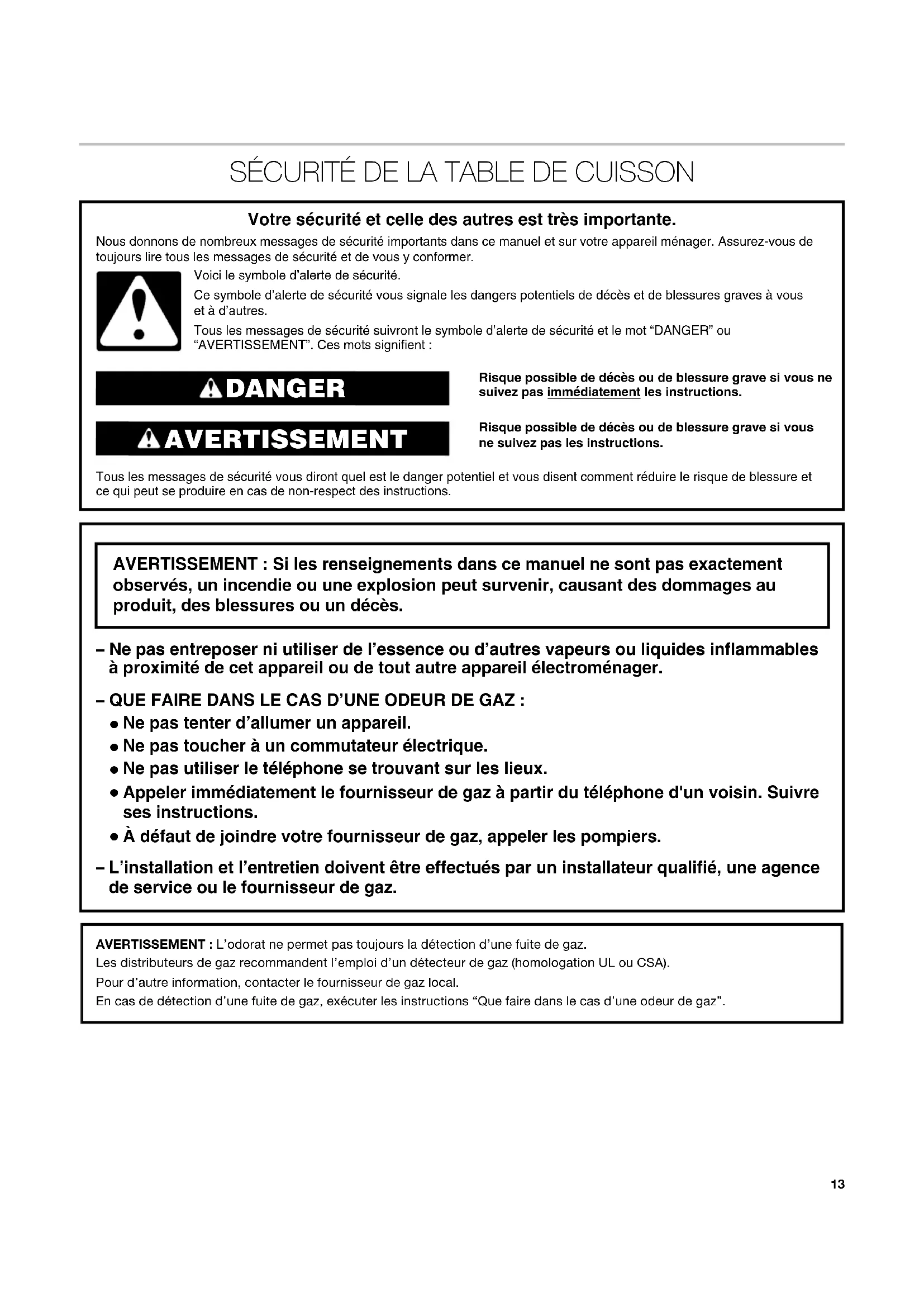 Jenn-Air makes no representations about the quality, durability, or need for service or repair of this major appliance other than the representations contained in this warranty. If you want a longer or more comprehensive warranty than the limited warranty that comes with this major appliance, you should ask Jenn-Air or your retailer about buying an extended warranty. LIMITATION OF REMEDIES; EXCLUSION OF INCIDENTAL AND CONSEQUENTIAL DAMAGES YOUR SOLE AND EXCLUSIVE REMEDY UNDER THIS LIMITED WARRANTY SHALL BE PRODUCT REPAIR AS PROVIDED HEREIN. JENN-AIR SHALL NOT BE LIABLE FOR INCIDENTAL OR CONSEQUENTIAL DAMAGES. Some states and provinces do not allow the exclusion or limitation of incidental or consequential damages, so these limitations and exclusions may not apply to you. This warranty gives you specific legal rights, and you also may have other rights that vary from state to state or province to province.11 Notes12 Notes13 SÉCURITÉ DE LA TABLE DE CUISSON Risque possible de décès ou de blessure grave si vous ne suivez pas immédiatement les instructions. Risque possible de décès ou de blessure grave si vous ne suivez pas les instructions. Tous les messages de sécurité vous diront quel est le danger potentiel et vous disent comment réduire le risque de blessure et ce qui peut se produire en cas de non-respect des instructions. Votre sécurité et celle des autres est très importante. Nous donnons de nombreux messages de sécurité importants dans ce manuel et sur votre appareil ménager. Assurez-vous de toujours lire tous les messages de sécurité et de vous y conformer. AVERTISSEMENT DANGER Voici le symbole d’alerte de sécurité. Ce symbole d’alerte de sécurité vous signale les dangers potentiels de décès et de blessures graves à vous et à d’autres. Tous les messages de sécurité suivront le symbole d’alerte de sécurité et le mot “DANGER” ou “AVERTISSEMENT”. Ces mots signifient :