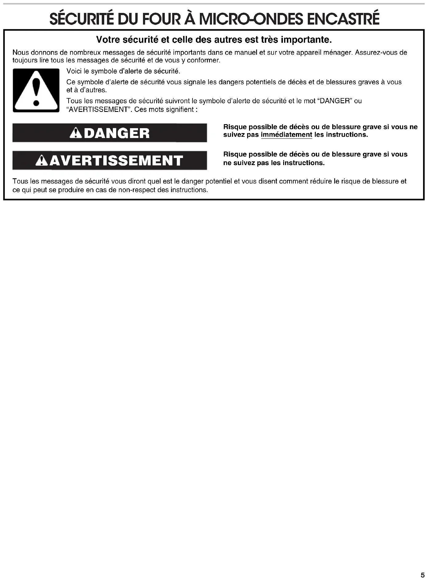 SÉCURITÉ DU FOUR À MICRO‑ONDES ENCASTRÉ Risque possible de décès ou de blessure grave si vous ne suivez pas immédiatement les instructions. Risque possible de décès ou de blessure grave si vous ne suivez pas les instructions. Tous les messages de sécurité vous diront quel est le danger potentiel et vous disent comment réduire le risque de blessure et ce qui peut se produire en cas de non-respect des instructions. Votre sécurité et celle des autres est très importante. Nous donnons de nombreux messages de sécurité importants dans ce manuel et sur votre appareil ménager. Assurez-vous de toujours lire tous les messages de sécurité et de vous y conformer. AVERTISSEMENT DANGER Voici le symbole d’alerte de sécurité. Ce symbole d’alerte de sécurité vous signale les dangers potentiels de décès et de blessures graves à vous et à d’autres. Tous les messages de sécurité suivront le symbole d’alerte de sécurité et le mot “DANGER” ou “AVERTISSEMENT”. Ces mots signifient :6