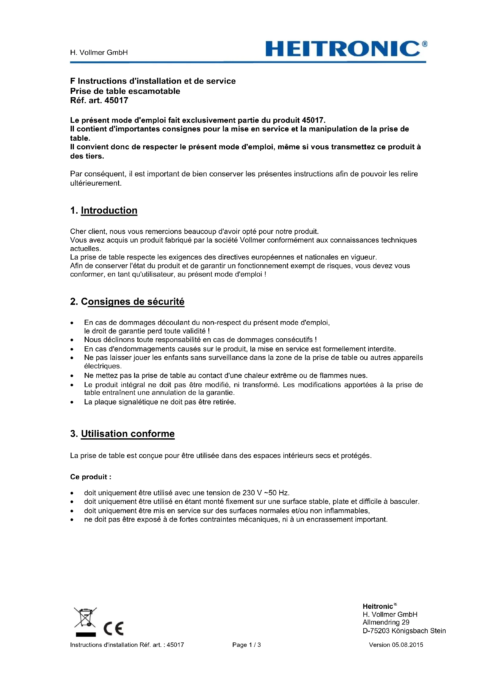 H. Vollmer GmbH Allmendring 29 D-75203 Königsbach SteinH. Vollmer GmbH Instructions d'installation Réf. art. : 45017 Page 1 / 3 Version 05.08.2015 F Instructions d'installation et de service Prise de table escamotable Réf. art. 45017 Le présent mode d'emploi fait exclusivement partie du produit 45017. Il contient d'importantes consignes pour la mise en service et la manipulation de la prise de table. Il convient donc de respecter le présent mode d'emploi, même si vous transmettez ce produit à des tiers. Par conséquent, il est important de bien conserver les présentes instructions afin de pouvoir les relire ultérieurement.