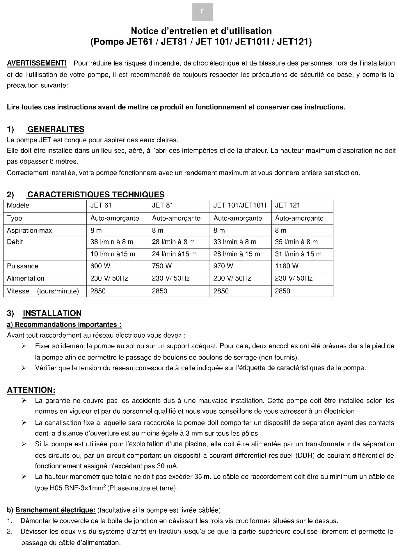 Notice d’entretien et d’utilisation (Pompe JET61 / JET81 / JET 101/ JET101I / JET121) AVERTISSEMENT! Pour réduire les risques d’incendie, de choc électrique et de blessure des personnes, lors de l’installation et de l’utilisation de votre pompe, il est recommandé de toujours respecter les précautions de sécurité de base, y compris la précaution suivante: Lire toutes ces instructions avant de mettre ce produit en fonctionnement et conserver ces instructions.