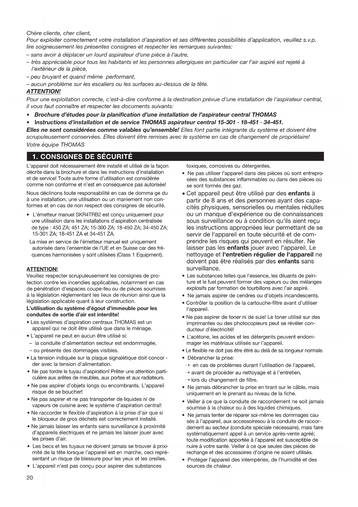 - Instructions d’installation et de service THOMAS aspirateur central 15-301 · 18-451 · 34-451. Elles ne sont considérées comme valables qu’ensemble! Elles font partie intégrante du système et doivent être scrupuleusement conservées. Elles doivent être remises avec le système en cas de changement de propriétaire! Votre équipe THOMAS