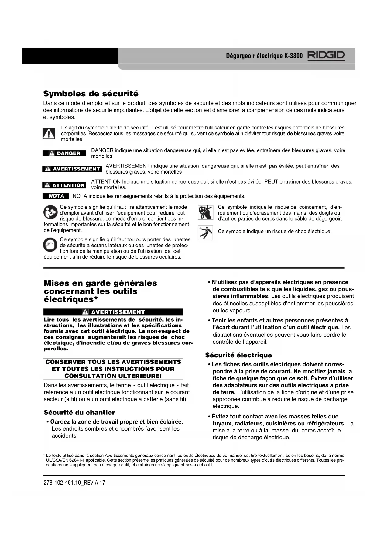 - Confiez l’outil électrique à un réparateur qualifié utilisant exclusivement des pièces de rechange identiques. Cela permet de garantir la sécurité de l’outil électrique. Consignes de sécurité particulières AVERTISSEMENT Lisez soigneusement ce manuel avant d’utiliser le dégorgeoir K-3800. Le non-respect des consignes suivantes augmenterait les risques de choc élec- trique, d’incendie et/ou de graves blessures cor- porelles. Veuillez adresser toutes questions éventuelles aux ser- vices techniques de Ridge Tool Company en composant le (800) 519-3456. Sécurité du dégorgeoir