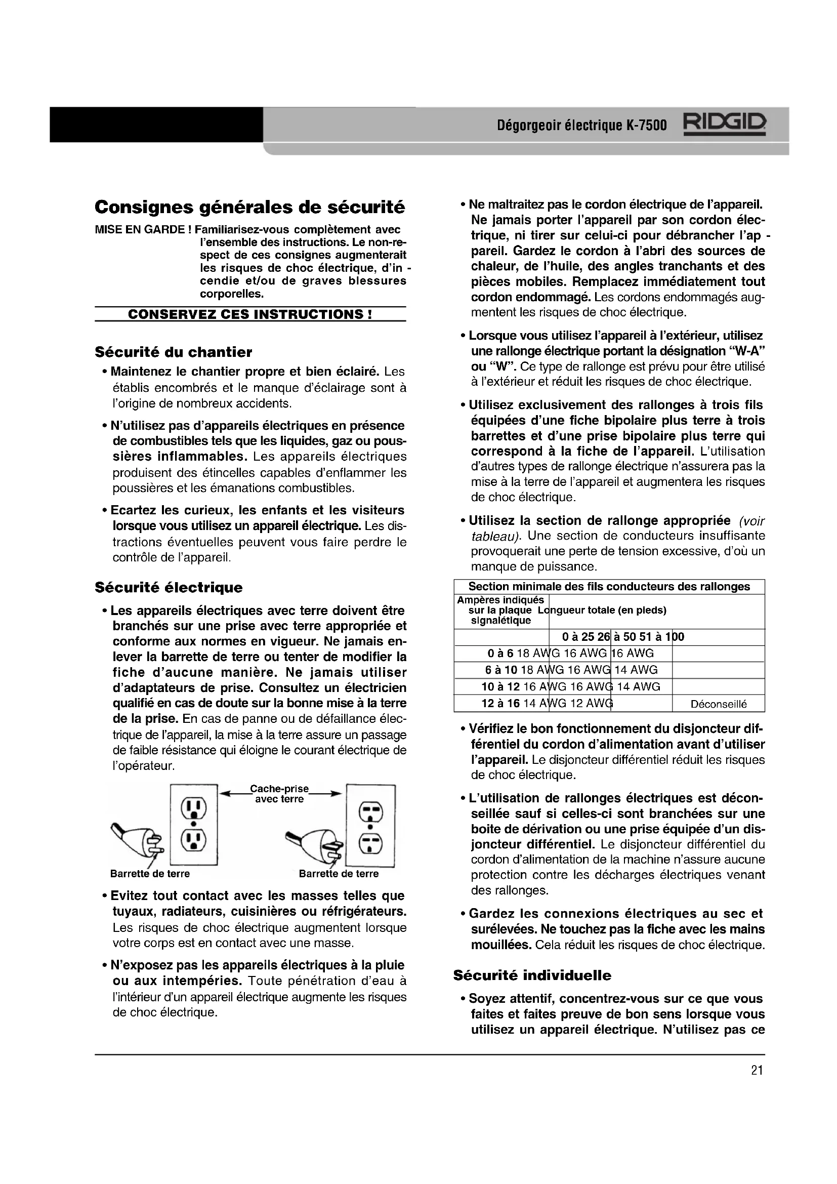 - Soyez attentif, concentrez-vous sur ce que vous faites et faites preuve de bon sens lorsque vous utilisez un appareil électrique. N’utilisez pas ce Section minimale des fils conducteurs des rallonges Ampères indiquéssur la plaque Longueur totale (en pieds)signalétique 0 à 25 26 à 50 51 à 100 0 à 6 18 AWG 16 AWG 16 AWG 6 à 10 18 AWG 16 AWG 14 AWG 10 à 12 16 AWG 16 AWG 14 AWG 12 à 16 14 AWG 12 AWG DéconseilléBarrette de terreCache-priseavec terreBarrette de terre22 Dégorgeoir électrique K-7500 type d’appareil lorsque vous êtes fatigués ou lorsque vous prenez des médicaments, de l’alcool ou des produits pharmaceutiques. Un instant d’inattention peut entraîner de graves blessures lorsque l’on utilise un appareil électrique.