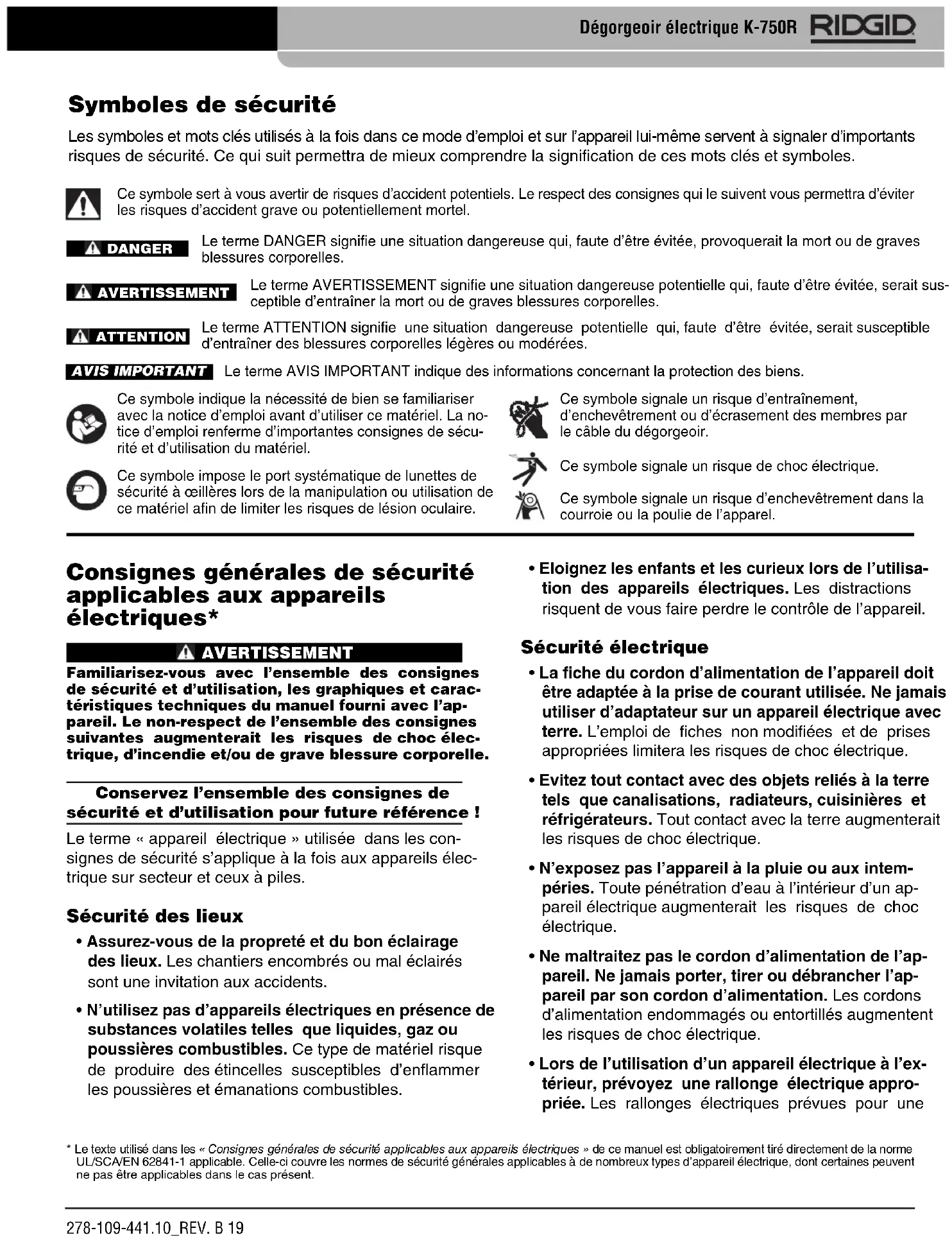 - Lors de l’utilisation d’un appareil électrique à l’ex- térieur, prévoyez une rallonge électrique appro- priée. Les rallonges électriques prévues pour une Ce symbole signale un risque d’entraînement, d’enchevêtrement ou d’écrasement des membres par le câble du dégorgeoir. Symboles de sécurité Les symboles et mots clés utilisés à la fois dans ce mode d’emploi et sur l’appareil lui-même servent à signaler d’importants risques de sécurité. Ce qui suit permettra de mieux comprendre la signification de ces mots clés et symboles. Ce symbole sert à vous avertir de risques d’accident potentiels. Le respect des consignes qui le suivent vous permettra d’éviter les risques d’accident grave ou potentiellement mortel. Le terme DANGER signifie une situation dangereuse qui, faute d’être évitée, provoquerait la mort ou de graves blessures corporelles. Le terme AVERTISSEMENT signifie une situation dangereuse potentielle qui, faute d’être évitée, serait sus- ceptible d’entraîner la mort ou de graves blessures corporelles. Le terme ATTENTION signifie une situation dangereuse potentielle qui, faute d’être évitée, serait susceptible d’entraîner des blessures corporelles légères ou modérées. Le terme AVIS IMPORTANT indique des informations concernant la protection des biens. Ce symbole indique la nécessité de bien se familiariser avec la notice d’emploi avant d’utiliser ce matériel. La no- tice d’emploi renferme d’importantes consignes de sécu- rité et d’utilisation du matériel. Ce symbole impose le port systématique de lunettes de sécurité à œillères lors de la manipulation ou utilisation de ce matériel afin de limiter les risques de lésion oculaire. AVIS IMPORTANTDANGERAVERTISSEMENTATTENTION Ce symbole signale un risque de choc électrique.