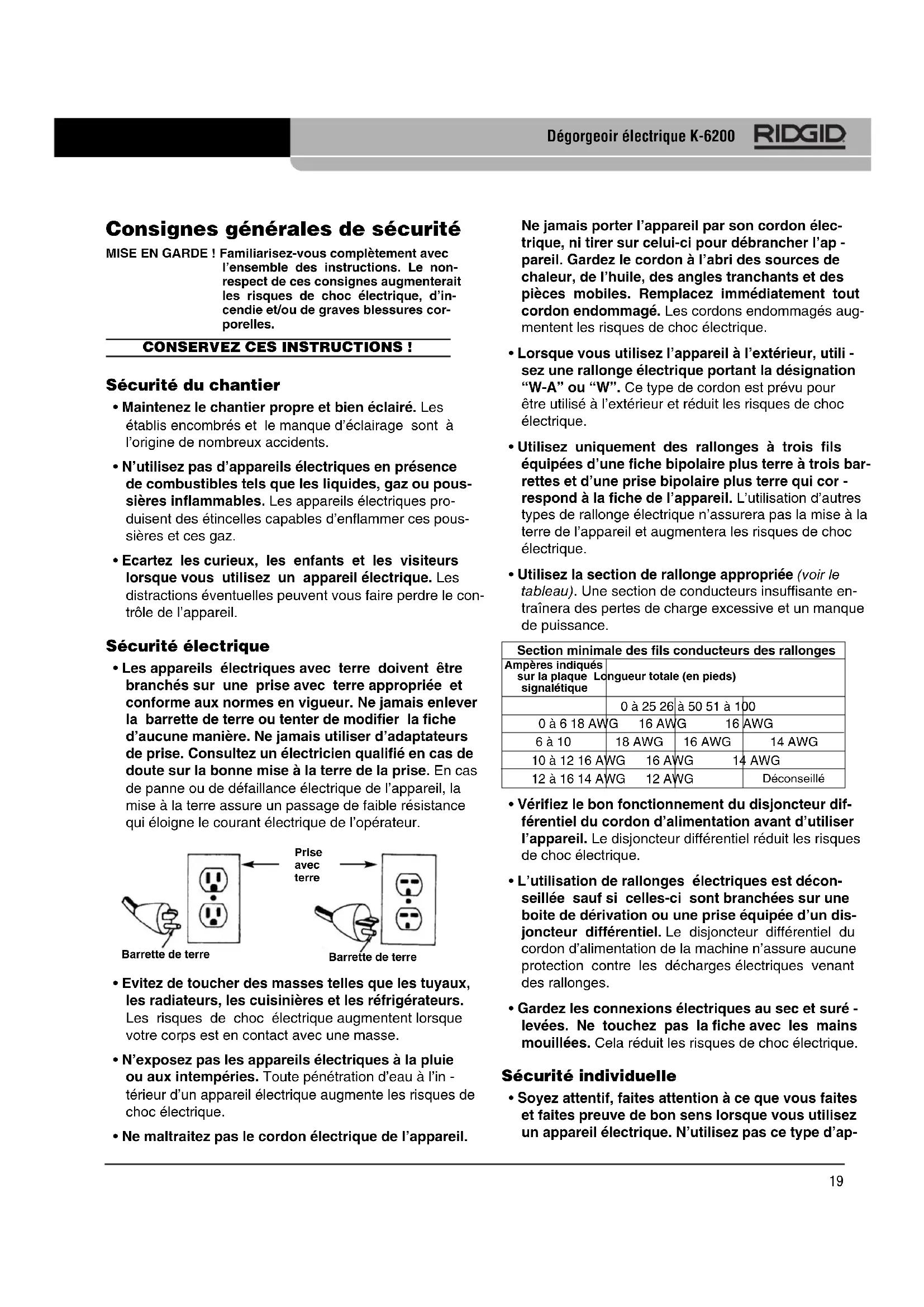 - Soyez attentif, faites attention à ce que vous faites et faites preuve de bon sens lorsque vous utilisez un appareil électrique. N’utilisez pas ce type d’ap- Barrette de terrePrise avec terreBarrette de terre Section minimale des fils conducteurs des rallonges Ampères indiquéssur la plaque Longueur totale (en pieds)signalétique 0 à 25 26 à 50 51 à 100 0 à 6 18 AWG 16 AWG 16 AWG 6 à 10 18 AWG 16 AWG 14 AWG 10 à 12 16 AWG 16 AWG 14 AWG 12 à 16 14 AWG 12 AWG Déconseillé20 Dégorgeoir électrique K-6200 pareil lorsque vous êtes fatigués ou lorsque vous prenez des médicaments, de l’alcool ou des pro- duits pharmaceutiques. Un instant d’inattention peut entraîner de graves blessures lorsque l’on utilise un ap- pareil électrique.