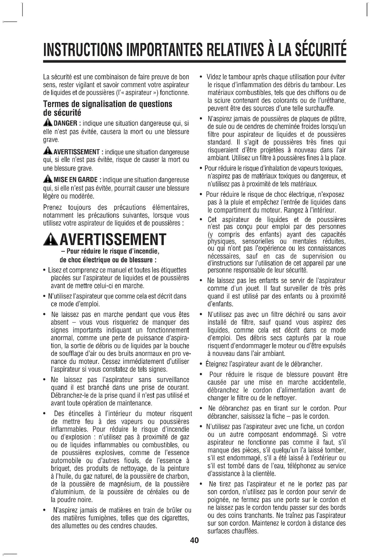 qui, si elle n’est pas évitée, risque de causer la mort ou une blessure grave. MISE EN GARDE : indique une situation dangereuse qui, si elle n’est pas évitée, pourrait causer une blessure légère ou modérée.Prenez toujours des précautions élémentaires, notamment les précautions suivantes, lorsque vous utilisez votre aspirateur de liquides et de poussières : AVERTISSEMENT – Pour réduire le risque d’incendie, de choc électrique ou de blessure :• Lisez et comprenez ce manuel et toutes les étiquettes placées sur l’aspirateur de liquides et de poussières avant de mettre celui-ci en marche.• N’utilisez l’aspirateur que comme cela est décrit dans ce mode d’emploi. • Ne laissez pas en marche pendant que vous êtes absent – vous vous risqueriez de manquer des signes importants indiquant un fonctionnement anormal, comme une perte de puissance d’aspira-tion, la sortie de débris ou de liquides par la bouche de soufflage d’air ou des bruits anormaux en pro ve-nance du moteur. Cessez immédiatement d’utiliser l’aspirateur si vous constatez de tels signes.• Ne laissez pas l’aspirateur sans surveillance quand il est branché dans une prise de courant. Débranchez-le de la prise quand il n’est pas utilisé et avant toute opération de maintenance.• Des étincelles à l’intérieur du moteur risquent de mettre feu à des vapeurs ou poussières inflammables. Pour réduire le risque d’incendie ou d’explosion : n’utilisez pas à proximité de gaz ou de liquides inflammables ou combustibles, ou de poussières explosives, comme de l’essence automobile ou d’autres fiouls, de l’essence à briquet, des produits de nettoyage, de la peinture à l’huile, du gaz naturel, de la poussière de charbon, de la poussière de magnésium, de la poussière d’aluminium, de la poussière de céréales ou de la poudre noire.• N’aspirez jamais de matières en train de brûler ou des matières fumigènes, telles que des cigarettes, des allumettes ou des cendres chaudes.• Videz le tambour après chaque utilisation pour éviter le risque d’inflammation des débris du tambour. Les matériaux combustibles, tels que des chiffons ou de la sciure contenant des colorants ou de l’uréthane, peuvent être des sources d’une telle surchauffe.• N’aspirez jamais de poussières de plaques de plâtre, de suie ou de cendres de cheminée froides lorsqu’un filtre pour aspirateur de liquides et de poussières standard. Il s’agit de poussières très fines qui risqueraient d’être projetées à nouveau dans l’air ambiant. Utilisez un filtre à poussières fines à la place.• Pour réduire le risque d’inhalation de vapeurs toxiques, n’aspirez pas de matériaux toxiques ou dangereux, et n’utilisez pas à proximité de tels matériaux.• Pour réduire le risque de choc électrique, n’exposez pas à la pluie et empêchez l’entrée de liquides dans le compartiment du moteur. Rangez à l’intérieur.• Cet aspirateur de liquides et de poussières n’est pas conçu pour emploi par des personnes (y compris des enfants) ayant des capacités physiques, sensorielles ou mentales réduites, ou qui n’ont pas l’expérience ou les connaissances nécessaires, sauf en cas de supervision ou d’instructions sur l’utilisation de cet appareil par une personne responsable de leur sécurité.• Ne laissez pas les enfants se servir de l’aspirateur comme d’un jouet. Il faut surveiller de très près quand il est utilisé par des enfants ou à proximité d’enfants.• N’utilisez pas avec un filtre déchiré ou sans avoir installé de filtre, sauf quand vous aspirez des liquides, comme cela est décrit dans ce mode d’emploi. Des débris secs capturés par la roue risquent d’endommager le moteur ou d’être expulsés à nouveau dans l’air ambiant.• Éteignez l’aspirateur avant de le débrancher.• Pour réduire le risque de blessure pouvant être causée par une mise en marche accidentelle, débranchez le cordon d’alimentation avant de changer le filtre ou de le nettoyer.• Ne débranchez pas en tirant sur le cordon. Pour débrancher, saisissez la fiche – pas le cordon.• N’utilisez pas l’aspirateur avec une fiche, un cordon ou un autre composant endommagé. Si votre aspirateur ne fonctionne pas comme il faut, s’il manque des pièces, s’il quelqu’un l’a laissé tomber, s’il est endommagé, s’il a été laissé à l’extérieur ou s’il est tombé dans de l’eau, téléphonez au service d’assistance à la clientèle.• Ne tirez pas l’aspirateur et ne le portez pas par son cordon, n’utilisez pas le cordon pour servir de poignée, ne fermez pas une porte sur le cordon et ne laissez pas le cordon tendu passer sur des bords ou des coins tranchants. Ne traînez pas l’aspirateur sur son cordon. Maintenez le cordon à distance des surfaces chauffées.41