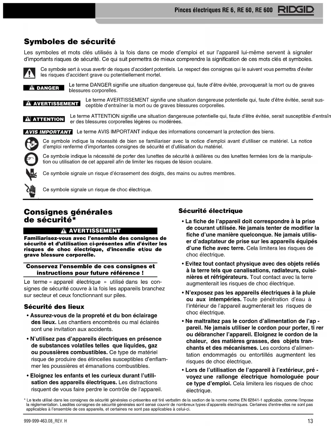 Pinces électriques RE 6, RE 60, RE 600 CONSERVEZ CES INSTRUCTIONS ! La mallette de l’appareil comprend un logement prévu pour garder ce manuel à la portée de tout utilisateur éventuel. Sécurité de la pince électrique