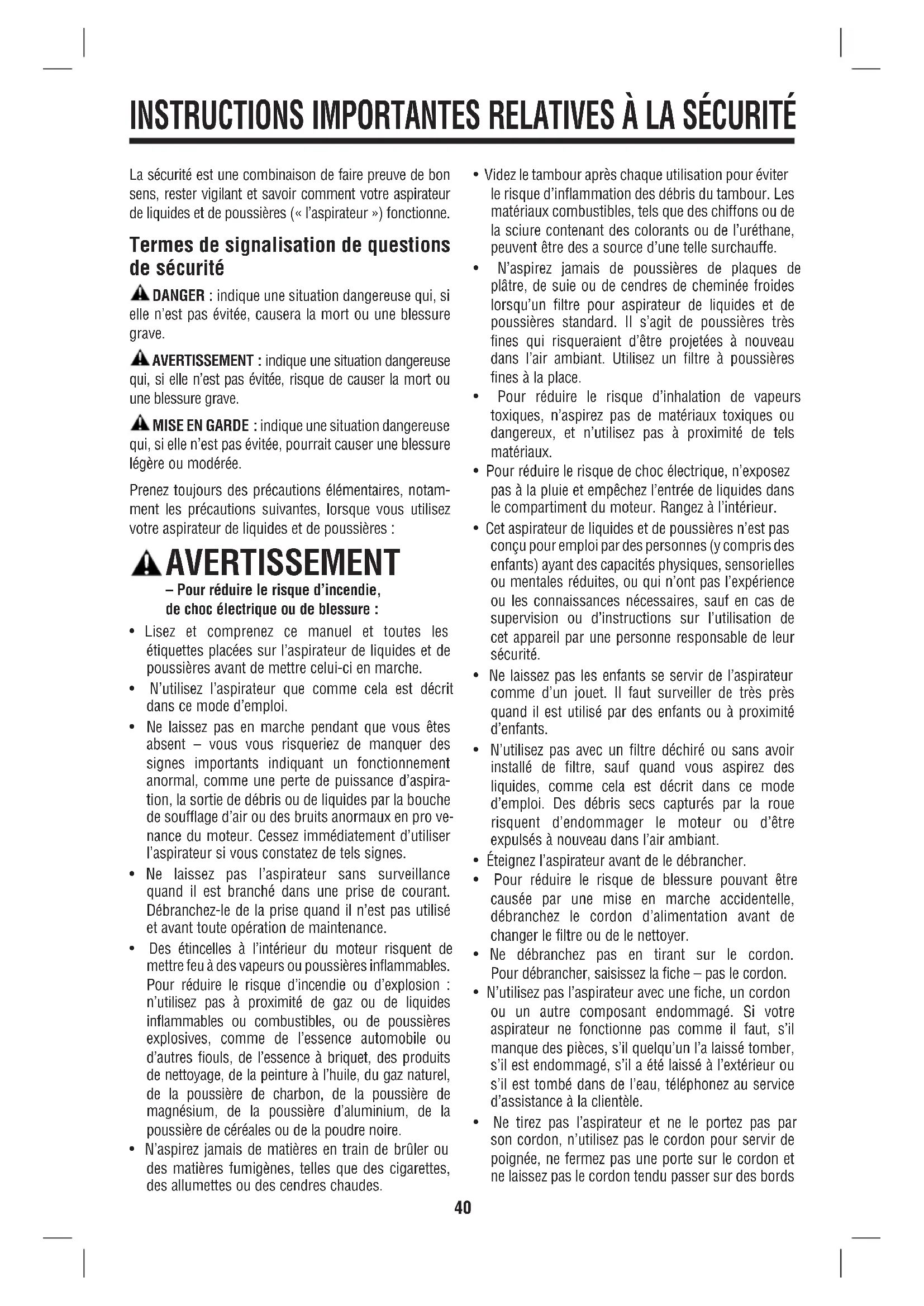 qui, si elle n’est pas évitée, risque de causer la mort ou une blessure grave. MISE EN GARDE : indique une situation dangereuse qui, si elle n’est pas évitée, pourrait causer une blessure légère ou modérée.Prenez toujours des précautions élémentaires, notam-ment les précautions suivantes, lorsque vous utilisez votre aspirateur de liquides et de poussières : AVERTISSEMENT – Pour réduire le risque d’incendie, de choc électrique ou de blessure :• Lisez et comprenez ce manuel et toutes les étiquettes placées sur l’aspirateur de liquides et de poussières avant de mettre celui-ci en marche.• N’utilisez l’aspirateur que comme cela est décrit dans ce mode d’emploi.• Ne laissez pas en marche pendant que vous êtes absent – vous vous risqueriez de manquer des signes importants indiquant un fonctionnement anormal, comme une perte de puissance d’aspira-tion, la sortie de débris ou de liquides par la bouche de soufflage d’air ou des bruits anormaux en pro ve-nance du moteur. Cessez immédiatement d’utiliser l’aspirateur si vous constatez de tels signes.• Ne laissez pas l’aspirateur sans surveillance quand il est branché dans une prise de courant. Débranchez-le de la prise quand il n’est pas utilisé et avant toute opération de maintenance.• Des étincelles à l’intérieur du moteur risquent de mettre feu à des vapeurs ou poussières inflammables. Pour réduire le risque d’incendie ou d’explosion : n’utilisez pas à proximité de gaz ou de liquides inflammables ou combustibles, ou de poussières explosives, comme de l’essence automobile ou d’autres fiouls, de l’essence à briquet, des produits de nettoyage, de la peinture à l’huile, du gaz naturel, de la poussière de charbon, de la poussière de magnésium, de la poussière d’aluminium, de la poussière de céréales ou de la poudre noire.• N’aspirez jamais de matières en train de brûler ou des matières fumigènes, telles que des cigarettes, des allumettes ou des cendres chaudes.• Videz le tambour après chaque utilisation pour éviter le risque d’inflammation des débris du tambour. Les matériaux combustibles, tels que des chiffons ou de la sciure contenant des colorants ou de l’uréthane, peuvent être des a source d’une telle surchauffe.• N’aspirez jamais de poussières de plaques de plâtre, de suie ou de cendres de cheminée froides lorsqu’un filtre pour aspirateur de liquides et de poussières standard. Il s’agit de poussières très fines qui risqueraient d’être projetées à nouveau dans l’air ambiant. Utilisez un filtre à poussières fines à la place.• Pour réduire le risque d’inhalation de vapeurs toxiques, n’aspirez pas de matériaux toxiques ou dangereux, et n’utilisez pas à proximité de tels matériaux.• Pour réduire le risque de choc électrique, n’exposez pas à la pluie et empêchez l’entrée de liquides dans le compartiment du moteur. Rangez à l’intérieur.• Cet aspirateur de liquides et de poussières n’est pas conçu pour emploi par des personnes (y compris des enfants) ayant des capacités physiques, sensorielles ou mentales réduites, ou qui n’ont pas l’expérience ou les connaissances nécessaires, sauf en cas de supervision ou d’instructions sur l’utilisation de cet appareil par une personne responsable de leur sécurité.• Ne laissez pas les enfants se servir de l’aspirateur comme d’un jouet. Il faut surveiller de très près quand il est utilisé par des enfants ou à proximité d’enfants.• N’utilisez pas avec un filtre déchiré ou sans avoir installé de filtre, sauf quand vous aspirez des liquides, comme cela est décrit dans ce mode d’emploi. Des débris secs capturés par la roue risquent d’endommager le moteur ou d’être expulsés à nouveau dans l’air ambiant.• Éteignez l’aspirateur avant de le débrancher.• Pour réduire le risque de blessure pouvant être causée par une mise en marche accidentelle, débranchez le cordon d’alimentation avant de changer le filtre ou de le nettoyer.• Ne débranchez pas en tirant sur le cordon. Pour débrancher, saisissez la fiche – pas le cordon.• N’utilisez pas l’aspirateur avec une fiche, un cordon ou un autre composant endommagé. Si votre aspirateur ne fonctionne pas comme il faut, s’il manque des pièces, s’il quelqu’un l’a laissé tomber, s’il est endommagé, s’il a été laissé à l’extérieur ou s’il est tombé dans de l’eau, téléphonez au service d’assistance à la clientèle.• Ne tirez pas l’aspirateur et ne le portez pas par son cordon, n’utilisez pas le cordon pour servir de poignée, ne fermez pas une porte sur le cordon et ne laissez pas le cordon tendu passer sur des bords41