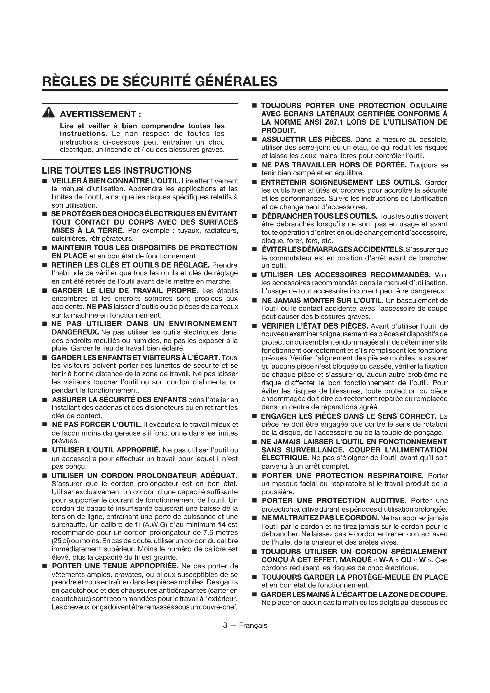 CONÇU À CET EFFET, MARQUÉ « W-A » OU « W ». Ces cordons réduisent les risques de choc électrique. TOUJOURS GARDER LA PROTÈGE-MEULE EN PLACE et en bon état de fonctionnement. GARDER LES MAINS À L’ÉCART DE LA ZONE DE COUPE. Ne placer en aucun cas la main ou les doigts au-dessous de4 — Français RÈGLES DE SÉCURITÉ GÉNÉRALES la pièce à couper ou sur la trajectoire de la muele. Toujours éteindre la scie. LES MUELES CONTINUENT DE TOURNER EN ROUE LIBRE UNE FOIS QUE LA SCIE EST ÉTEINTE. NE JAMAIS UTILISER CET OUTIL DANS UNE ATMOSPHÈRE EXPLOSIVE. Les étincelles normalement produites par le moteur pourraient enflammer les vapeurs. INSPECTER RÉGULIÈREMENT LES CORDONS DE L’OUTIL. Faire remplacer tout commutateur défectueux par un technicien qualifié ou un centre de réparations agréé. Le fil à gaine verte, avec ou sans traceur jaune est le fil de terre. Si le cordon doit être réparé ou remplacé, ne pas connecter le fil de terre de l’outil sur une borne sous tension. Tout cordon endommagé doit être réparé ou remplacé immédiatement. Toujours rester conscient de l’emplacement du cordon et veiller à le tenir à l’écart de la meule en rotation.
