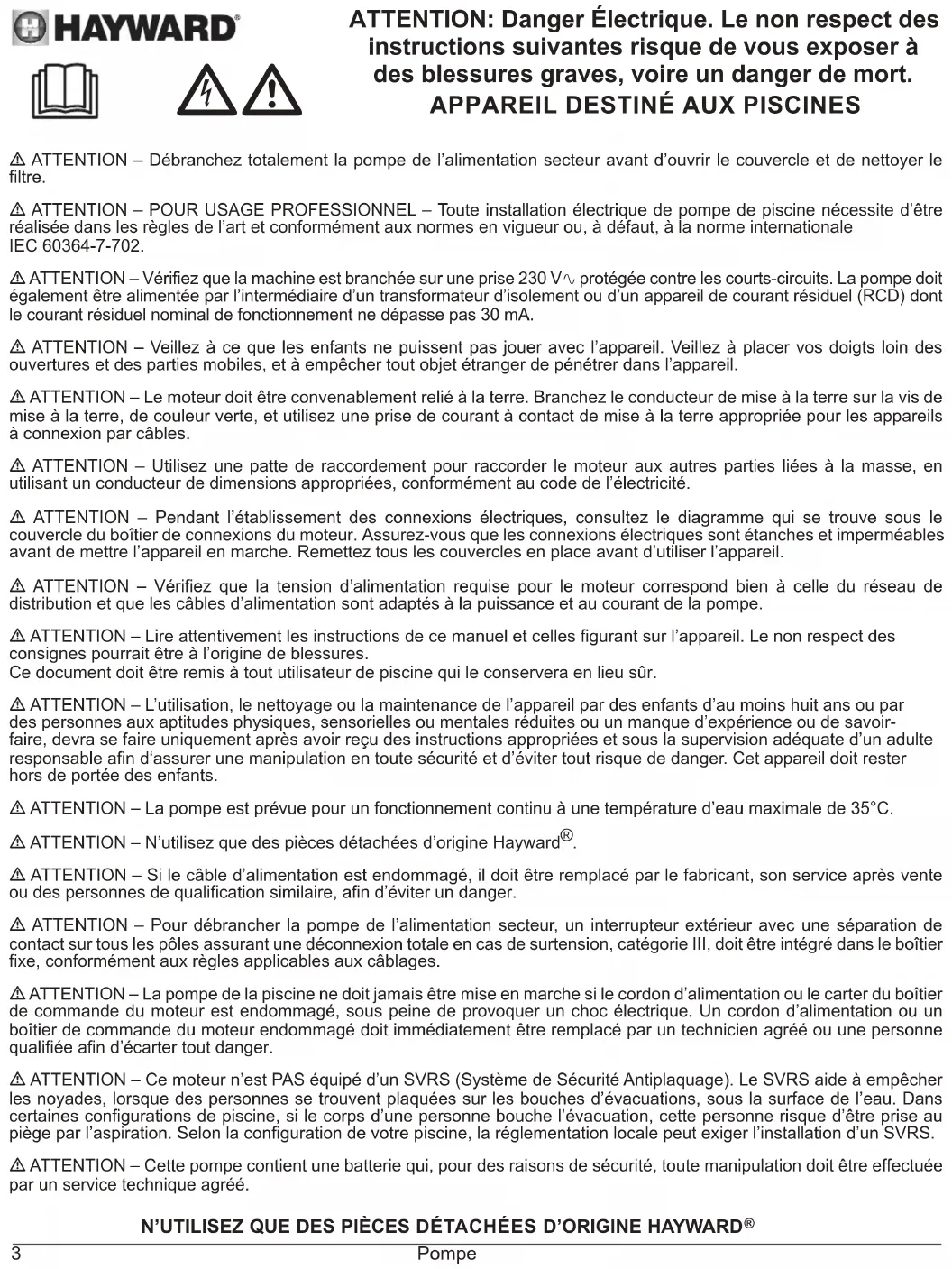 - ATTENTION – N’utilisez que des pièces détachées d’origine Hayward
