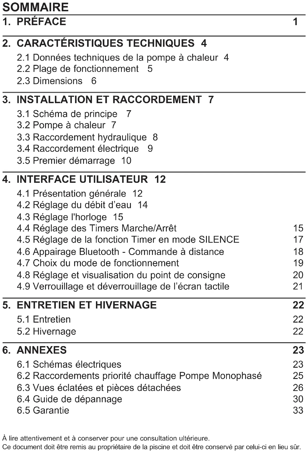 SOMMAIRE À lire attentivement et à conserver pour une consultation ultérieure. Ce document doit être remis au propriétaire de la piscine et doit être conservé par celui-ci en lieu sûr.1