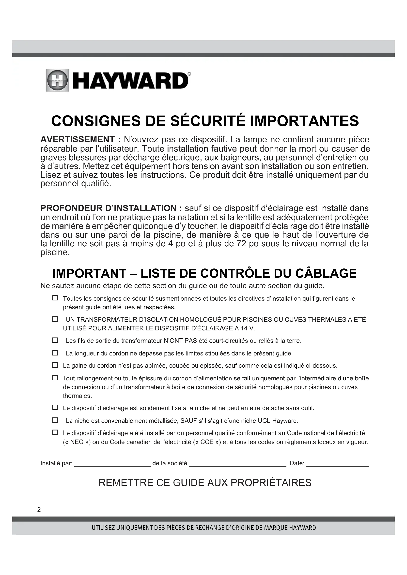 Toutes les consignes de sécurité susmentionnées et toutes les directives d’installation qui gurent dans le présent guide ont été lues et respectées. UN TRANSFORMATEUR D’ISOLATION HOMOLOGUÉ POUR PISCINES OU CUVES THERMALES A ÉTÉ UTILISÉ POUR ALIMENTER LE DISPOSITIF D’ÉCLAIRAGE À 14 V. Les ls de sortie du transformateur N’ONT PAS été court-circuités ou reliés à la terre. La longueur du cordon ne dépasse pas les limites stipulées dans le présent guide. La gaine du cordon n’est pas abîmée, coupée ou épissée, sauf comme cela est indiqué ci-dessous. Tout rallongement ou toute épissure du cordon d’alimentation se fait uniquement par l’intermédiaire d’une boîte de connexion ou d’un transformateur à boîte de connexion de sécurité homologués pour piscines ou cuves thermales. Le dispositif d’éclairage est solidement xé à la niche et ne peut en être détaché sans outil. La niche est convenablement métallisée, SAUF s’il s’agit d’une niche UCL Hayward. Le dispositif d’éclairage a été installé par du personnel qualié conformément au Code national de l’électricité (« NEC ») ou du Code canadien de l’électricité (« CCE ») et à tous les codes ou règlements locaux en vigueur.Installé par: ______________________ de la société ____________________________ Date: __________________ REMETTRE CE GUIDE AUX PROPRIÉTAIRESUTILISEZ UNIQUEMENT DES PIÈCES DE RECHANGE D’ORIGINE DE MARQUE HAYWARD