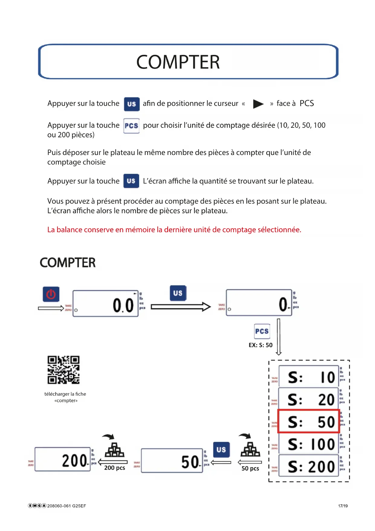 Appuyer sur la touche an de positionner le curseur « » face à PCS Appuyer sur la touche pour choisir l’unité de comptage désirée (10, 20, 50, 100 ou 200 pièces) Puis déposer sur le plateau le même nombre des pièces à compter que l’unité de comptage choisie Appuyer sur la touche L’écran ache la quantité se trouvant sur le plateau. Vous pouvez à présent procéder au comptage des pièces en les posant sur le plateau. L’écran ache alors le nombre de pièces sur le plateau. La balance conserve en mémoire la dernière unité de comptage sélectionnée. COMPTER EX: S: 50 50 pcs 200 pcs télécharger la che «compter» 208060-061 G25EF 17/19CALIBRER 5 kg 5 kg Appuyer &maintenir (EX: 25615) Un calibrage régulier est nécessaire pour garantir la abilité et la précision des pesées.