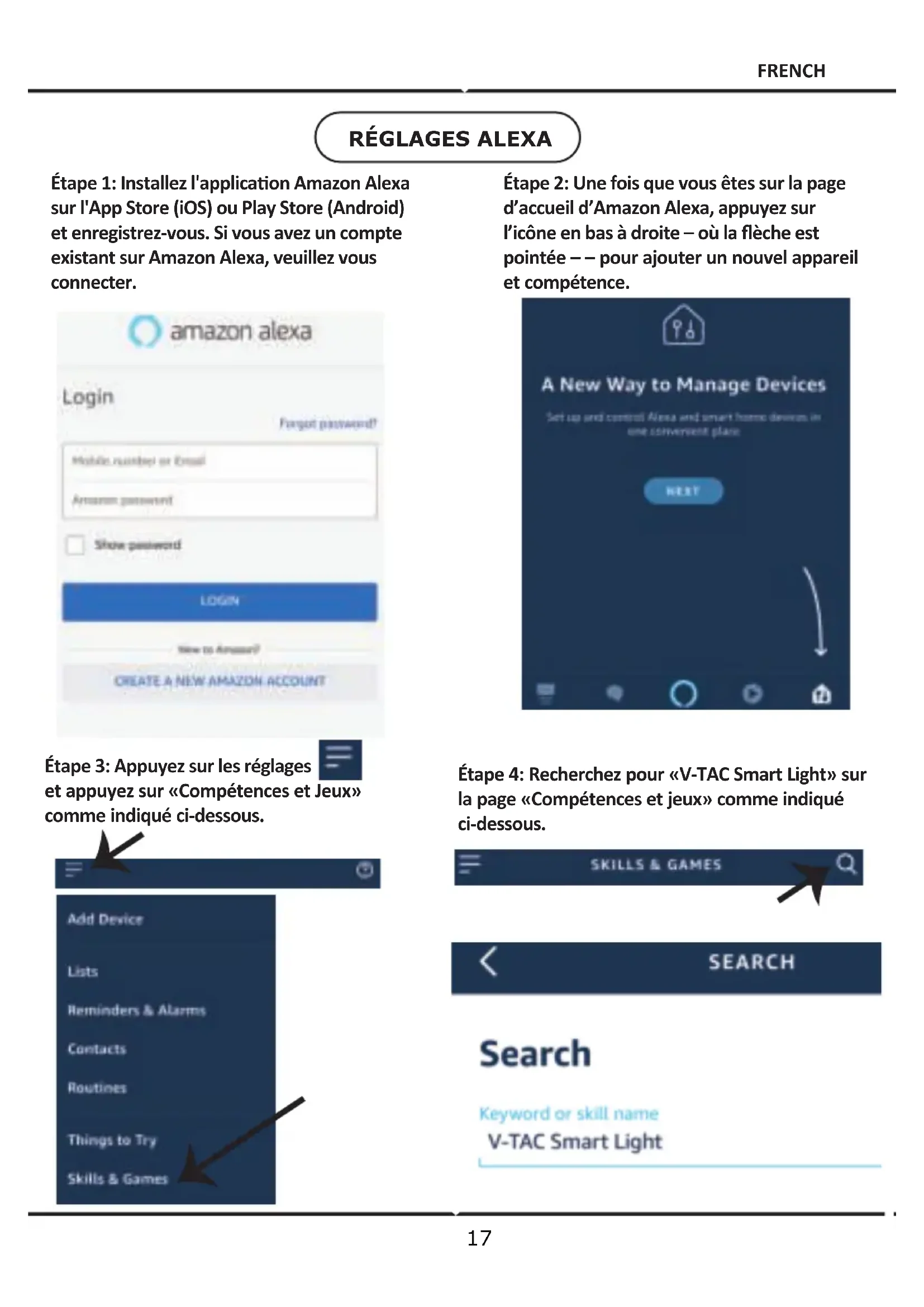 Étape 1: Installez l'applicaon Amazon Alexa sur l'App Store (iOS) ou Play Store (Android) et enregistrez-vous. Si vous avez un compte existant sur Amazon Alexa, veuillez vous connecter. Étape 2: Une fois que vous êtes sur la page d’accueil d’Amazon Alexa, appuyez sur l’icône en bas à droite – où la flèche est pointée – – pour ajouter un nouvel appareil et compétence. FRENCH18 Étape 5: Acver la compétence. Étape 6: Saisissez le nom d’ulisateur et le mot de passe pour vous connecter sur V-TAC Smart Light et appuyez sur «Appairage maintenant» Étape 7: Une fois que vous avez appuyé sur «Appairage maintenant», vous serez redirigé vers une nouvelle page qui demande une autorisaon (réf. l’image ci-dessous) Appuyez «Autoriser». Étape 8: Vous recevrez une confirmaon du compte appairé avec succès (réf. l’image ci-dessous) FRENCHMaintenant, vous pouvez contrôler votre appareil intelligent à l’aide de commandes vocales sur Alexa. Voici quelques commandes que vous pouvez uliser: Nota: La détection d’un appareil doit être effectuée chaque fois quand le nom de l’appareil est modifié sur l’application.