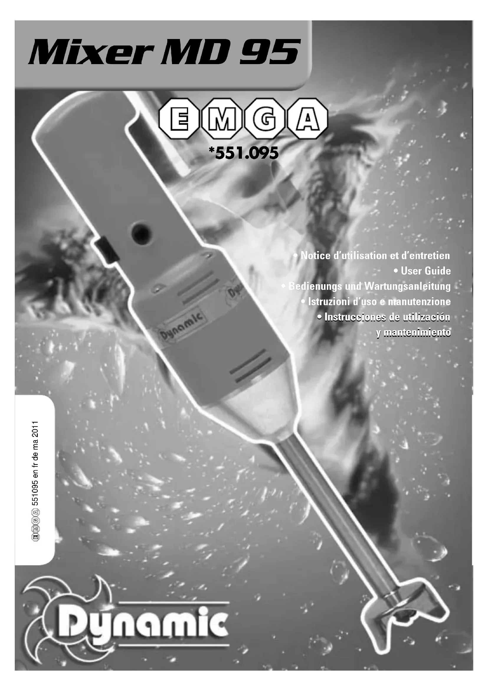 Déclaration de conformité - Service après-vente et garanties Certificate of conformity - Customer Service and warranty Konformitätsbescheinigung CE - Kundendienst und Garantie Dichiarazione di conformita’alle - Servizio assistenza e garanzia Declaración de conformidad - Servicio, postventa y garantia Mixer MD 95 page 7 Attestation de conformité aux règles d’hygiène et de sécurité du travail : Attestons que l’appareil mixer MD 95 DYNAMIC est conforme aux exigences essentielles de la norme EN 12853. Service après-vente et garantie : Si votre appareil ne fonctionne plus normalement ou s’il pré- sente des anomalies, contactez votre revendeur ou expédiez-le à l’adresse suivante : Dynamic France S.A.S. Z.I. du Puy Nardon – B.P.57 85290 Mortagne-sur-Sèvre Cedex Tél. 02 51 63 02 72 Fax : 02 51 63 02 73 e-mail : dynamic-France@wanadoo.fr Canada Service Centre Dynamic International Ltd. 5859 Chemin Saint-François Saint-Laurent - Québec H4S-1B6 Toll free phone : 1-800-267-7794 Toll free fax : 1-877- 668-6623 Local Phone : (514) 956 0127 Local Fax : (514) 956 8983 Cet appareil est garanti un an à partir de la date d’achat, contre tout vice de fabrication. La garantie DYNAMIC couvre totalement pièces et main d’oeuvre. La garantie concerne le rempla- cement de toute pièce défec- tueuse, mais ne saurait couvrir les bris par chute ou choc, les détériorations provoquées par un emploi anormal, les erreurs de branchement ou le non respect des conditions d’utilisa- tion prescrites dans la notice d’emploi. Pour être valable, le bon de garantie doit être :