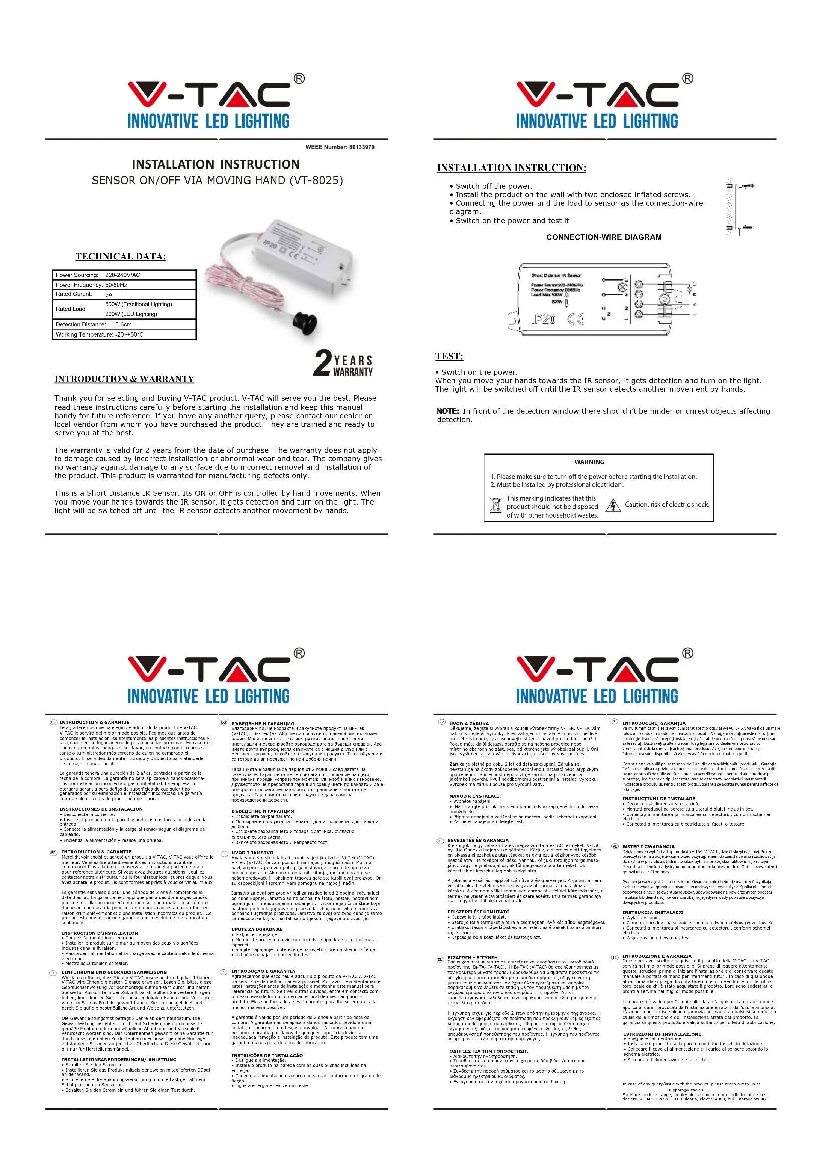 - Mettre sous tension et tester. INTRODUCTION & GARANTIE Le agradecemos que ha elegido y adquirido la product de V-TAC. V-TAC le servirá del mejor modo posible. Pedimos que antes de comenzar la instalación lea atentamente las presentes instrucciones y las guarde en un lugar adecuado para consultas próximas. En caso de dudas o preguntas, póngase, por favor, en contacto con el represen- tante o suministrador más cercano de quien ha comprado el producto. Él será debidamente instruido y dispuesto para atenderle de la mejor manera posible. La garantía tendrá una duración de 2 años, contados a partir de la fecha de la compra. La garantía no será aplicable a daños ocasiona- dos por instalación incorrecta o gasto inhabitual. La empresa no otorgará garantía para daños de superficies de cualquier tipo generados por su eliminación e instalación incorrectas. La garantía cubrirá solo defectos de producción de fábrica. INTRODUCTION & GARANTIE Merci d’avoir choisi et acheté un produit à V-TAC. V-TAC vous offrira le meilleur. Veuillez lire attentivement ces instructions avant de commencer l’installation et conservez ce manuel à portée de main pour référence ultérieure. Si vous avez d’autres questions, veuillez contacter notre distributeur ou le fournisseur local auprès duquel vous avez acheté le produit. Ils sont formés et prêts à vous servir au mieux La garantie est valable pour une période de 2 ans à compter de la date d’achat. La garantie ne s’applique pas à des dommages causés par une installation incorrecte ou une usure anormale. La société ne donne aucune garantie pour des dommages causés à une surface en raison d’un enlèvement et d’une installation incorrects du produit. Ce produit est couvert par une garantie pour des défauts de fabrication seulement.