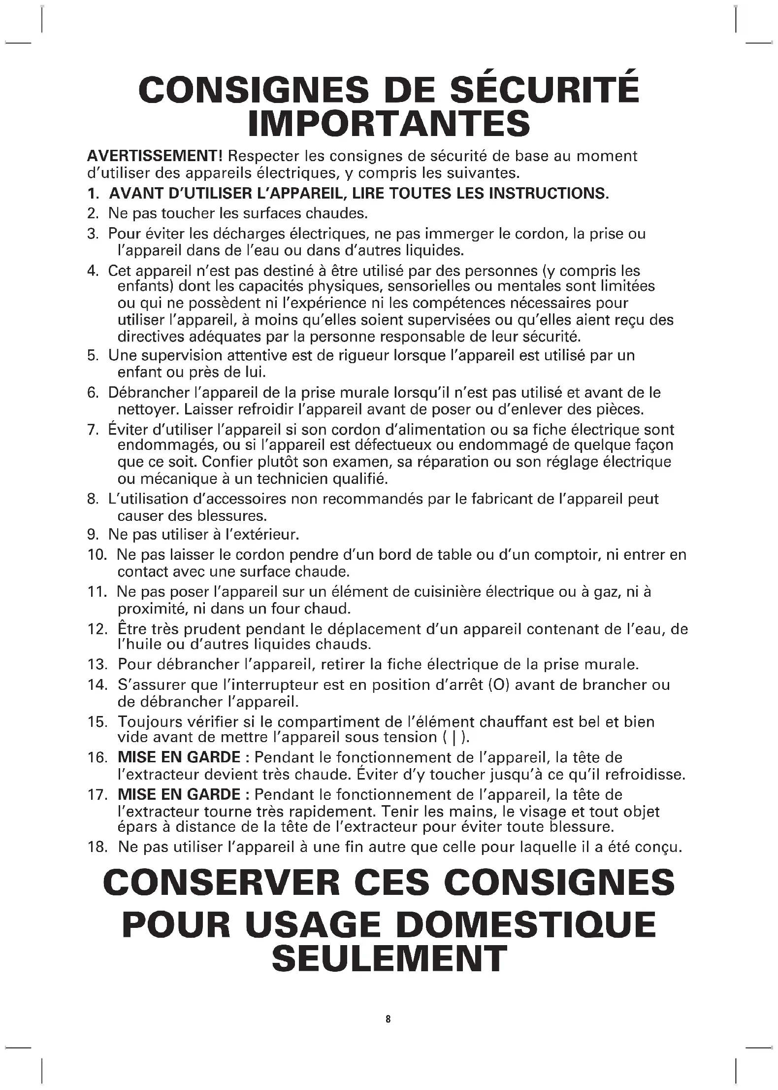 - MISE EN GARDE: Pendant le fonctionnement de l'appareil, la tête de l'extracteur tourne très rapidement. Tenir les mains, le visage et tout objet épars à distance de la tête de l'extracteur pour éviter toute blessure.