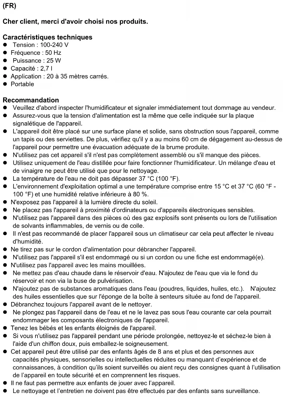 Aufbewahrung Reinigen Sie den Luftbefeuchter gemäß der Reinigungsvorschrift und trocknen Sie ihn gründlich. Wickeln Sie das Kabel nicht um das Gerät. Lagern Sie das Gerät in der Originalverpackung bei Raumtemperatur und unzugänglich für Babys und Kinder. Hinweis: Der Hersteller behält sich das Recht vor, ohne vorherige Ankündigung Änderungen am Gerät vorzunehmen, die seine technischen Eigenschaften nicht beeinträchtigen und die sich aus Verbesserungen in der Konstruktion oder Produktionstechnik ergeben. Entsorgung Entsorgen Sie das Gerät umweltgerecht. Es darf nicht über den normalen Hausmüll entsorgt werden. Bitte entsorgen Sie es an einer Sammelstelle für gebrauchte Elektro- und Elektronikgeräte. Weitere Informationen erhalten Sie bei Ihren örtlichen Behörden.(FR) Cher client, merci d'avoir choisi nos produits. Caractéristiques techniques l Tension : 100-240 V l Fréquence : 50 Hz l Puissance : 25 W l Capacité : 2,7 l l Application : 20 à 35 mètres carrés. l Portable Recommandation l Veuillez d'abord inspecter l'humidificateur et signaler immédiatement tout dommage au vendeur. l Assurez-vous que la tension d'alimentation est la même que celle indiquée sur la plaque signalétique de l'appareil. l L'appareil doit être placé sur une surface plane et solide, sans obstruction sous l'appareil, comme un tapis ou des serviettes. De plus, vérifiez qu'il y a au moins 60 cm de dégagement au-dessus de l'appareil pour permettre une évacuation adéquate de la brume produite. l N'utilisez pas cet appareil s'il n'est pas complètement assemblé ou s'il manque des pièces. l Utilisez uniquement de l'eau distillée pour faire fonctionner l'humidificateur. Un mélange d'eau et de vinaigre ne peut être utilisé que pour le nettoyage. l La température de l'eau ne doit pas dépasser 37 °C (100 °F). l L'environnement d'exploitation optimal a une température comprise entre 15 °C et 37 °C (60 °F - 100 °F) et une humidité relative inférieure à 80 %. l N'exposez pas l'appareil à la lumière directe du soleil. l Ne placez pas l'appareil à proximité d'ordinateurs ou d'appareils électroniques sensibles. l N'utilisez pas l'appareil dans des pièces où des gaz explosifs sont présents ou lors de l'utilisation de solvants inflammables, de vernis ou de colle. l Il n'est pas recommandé de placer l'appareil sous un climatiseur car cela peut affecter le niveau d'humidité. l Ne tirez pas sur le cordon d'alimentation pour débrancher l'appareil. l N'utilisez pas l'appareil s'il est endommagé ou si un cordon ou une fiche est endommagé(e). l N'utilisez pas l'appareil avec les mains mouillées. l Ne mettez pas d'eau chaude dans le réservoir d'eau. N'ajoutez de l'eau que via le fond du réservoir et non via la buse de pulvérisation. l N'ajoutez pas de substances aromatiques dans l'eau (poudres, liquides, huiles, etc.). N'ajoutez des huiles essentielles que sur l'éponge de la boîte à senteurs située au fond de l'appareil. l Débranchez toujours l'appareil avant de le nettoyer. l Ne plongez pas l'appareil dans de l'eau et ne le lavez pas sous l'eau courante car cela pourrait endommager les composants électroniques de l'appareil. l Tenez les bébés et les enfants éloignés de l'appareil. l Si vous n'utilisez pas l'appareil pendant une période prolongée, nettoyez-le et séchez-le bien à l'aide d'un chiffon doux, puis emballez-le soigneusement. l Cet appareil peut être utilisé par des enfants âgés de 8 ans et plus et des personnes aux capacités physiques, sensorielles ou intellectuelles réduites ou manquant d’expérience et de connaissances, à condition qu’ils soient surveillés ou aient reçu des consignes quant à l’utilisation de l’appareil en toute sécurité et en comprennent les risques. l Il ne faut pas permettre aux enfants de jouer avec l’appareil. l Le nettoyage et l’entretien ne doivent pas être effectués par des enfants sans surveillance.Avant la première utilisation l Retirez l'appareil de son emballage. l Ne laissez pas les matériaux d'emballage (sacs plastiques, polystyrène, etc.) à la portée des bébés ou des enfants. l Après un transport de l'appareil à basses températures, laissez-le dans la pièce pendant 2 heures pour qu'il revienne à température ambiante avant de l'utiliser. l Ne mettez rien d'autre dans le réservoir à eau que de l'eau propre.