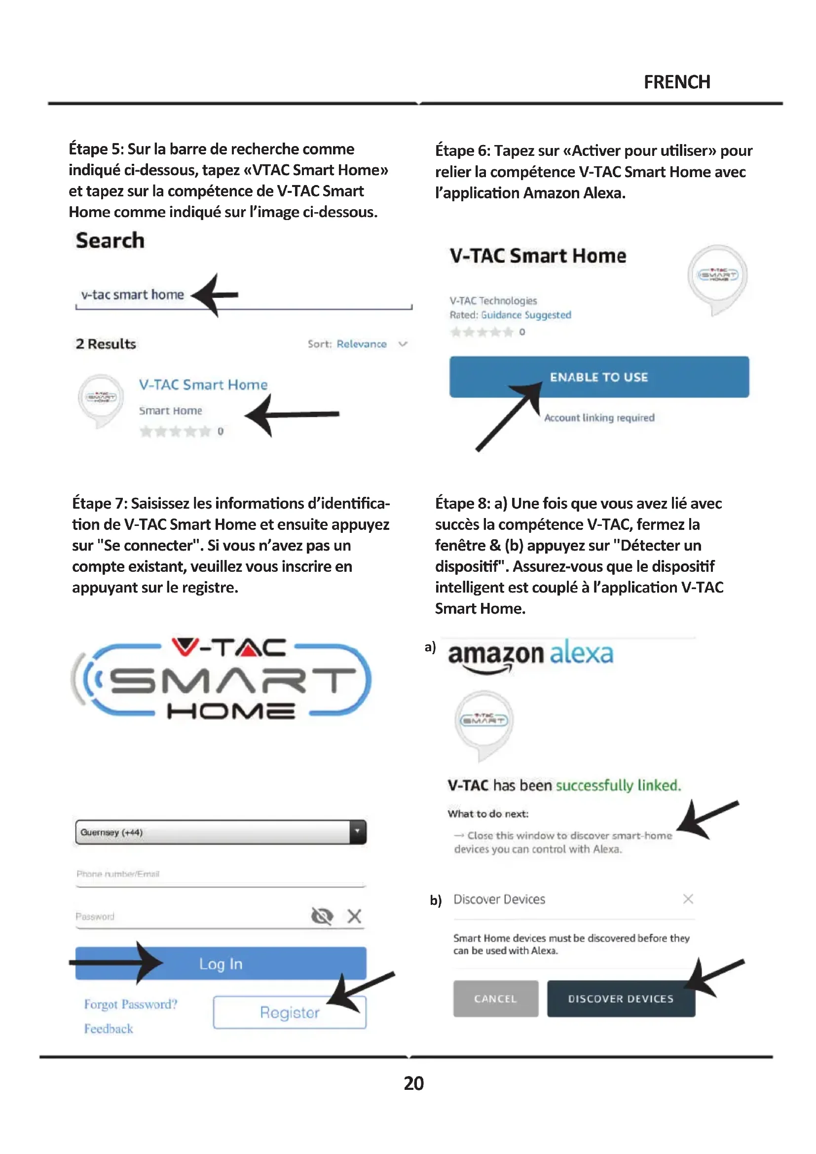 19Étape 5: Sur la barre de recherche comme indiqué ci-dessous, tapez «VTAC Smart Home» et tapez sur la compétence de V-TAC Smart Home comme indiqué sur l’image ci-dessous. Étape 6: Tapez sur «Acver pour uliser» pour relier la compétence V-TAC Smart Home avec l’applicaon Amazon Alexa. Étape 7: Saisissez les informaons d’idenfica- on de V-TAC Smart Home et ensuite appuyez sur "Se connecter". Si vous n’avez pas un compte existant, veuillez vous inscrire en appuyant sur le registre. Étape 8: a) Une fois que vous avez lié avec succès la compétence V-TAC, fermez la fenêtre & (b) appuyez sur "Détecter un disposif". Assurez-vous que le disposif intelligent est couplé à l’applicaon V-TAC Smart Home.