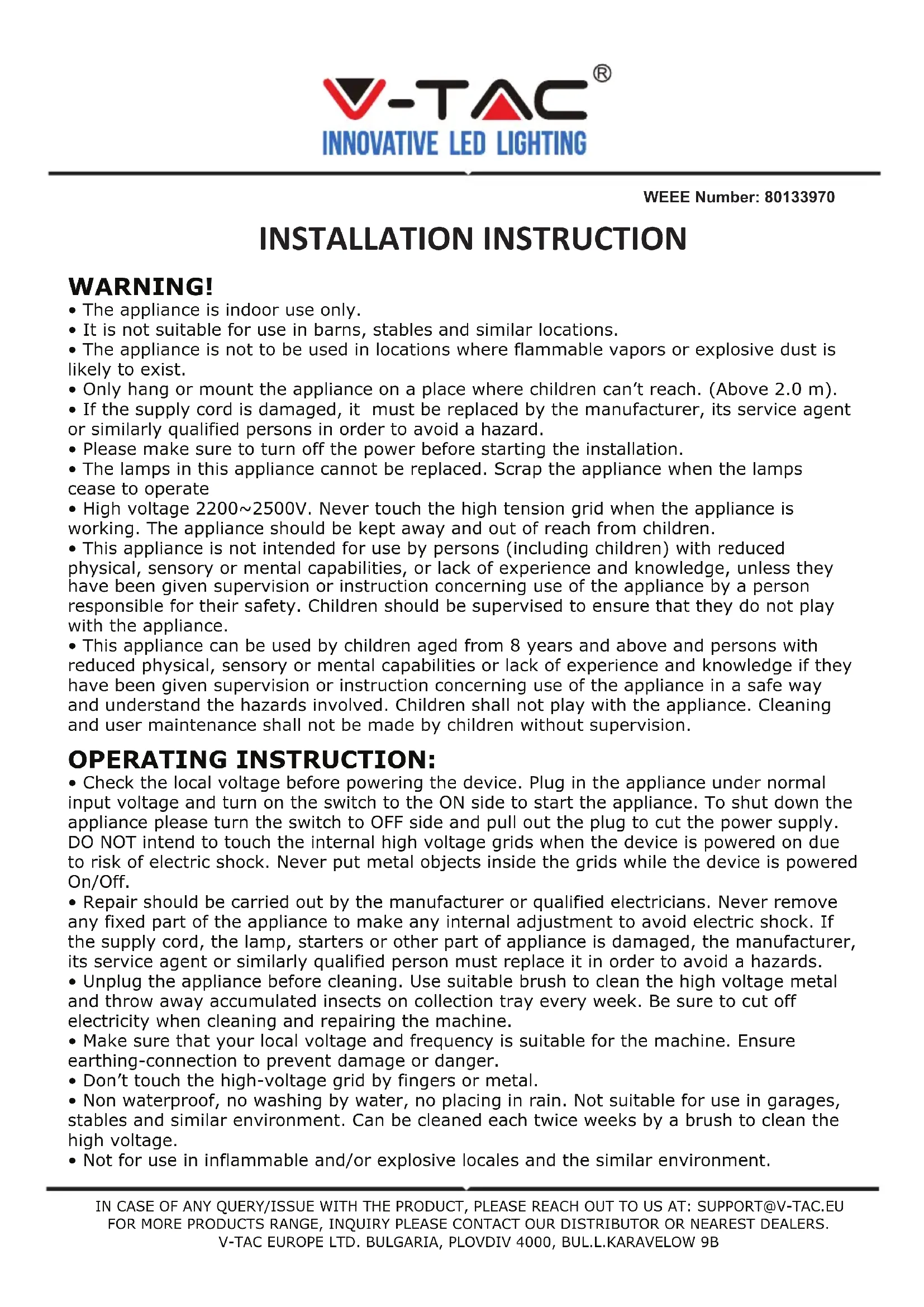 - Please turn off all other light source in the room for the best performance.. TECHNICAL DATA: Model No VT-3216 VT-3220 VT-3230 VT-3240 Power 16W 20W 30W 40W Tubes 2*8W UV Tubes 2*10W UV Tubes 2*15W UV Tubes 2*20W UV Tubes Coverage Area 50m² 80m² 100m² 150m² Size 354x93.5x280mm 397x93.5x280mm 502x93.5x280mm 655x93.5x280mm Lamp Life Up to 80,000 Hours Up to 80,000 Hours Up to 80,000 Hours Up to 80,000 Hours Input Power AC 220-240V, 50/60 HzINTRODUCTION Merci d’avoir choisi et acheté un tube de à LED de V-TAC. V-TAC vous offrira le meilleur. Veuillez lire attentivement ces instructions avant de commencer l’installation et conservez ce manuel à portée de main pour référence ultérieure. Si vous avez d’autres questions, veuillez contacter notre distributeur ou le fournisseur local auprès duquel vous avez acheté le produit. Ils sont formés et prêts à vous servir au mieux. ATTENTION