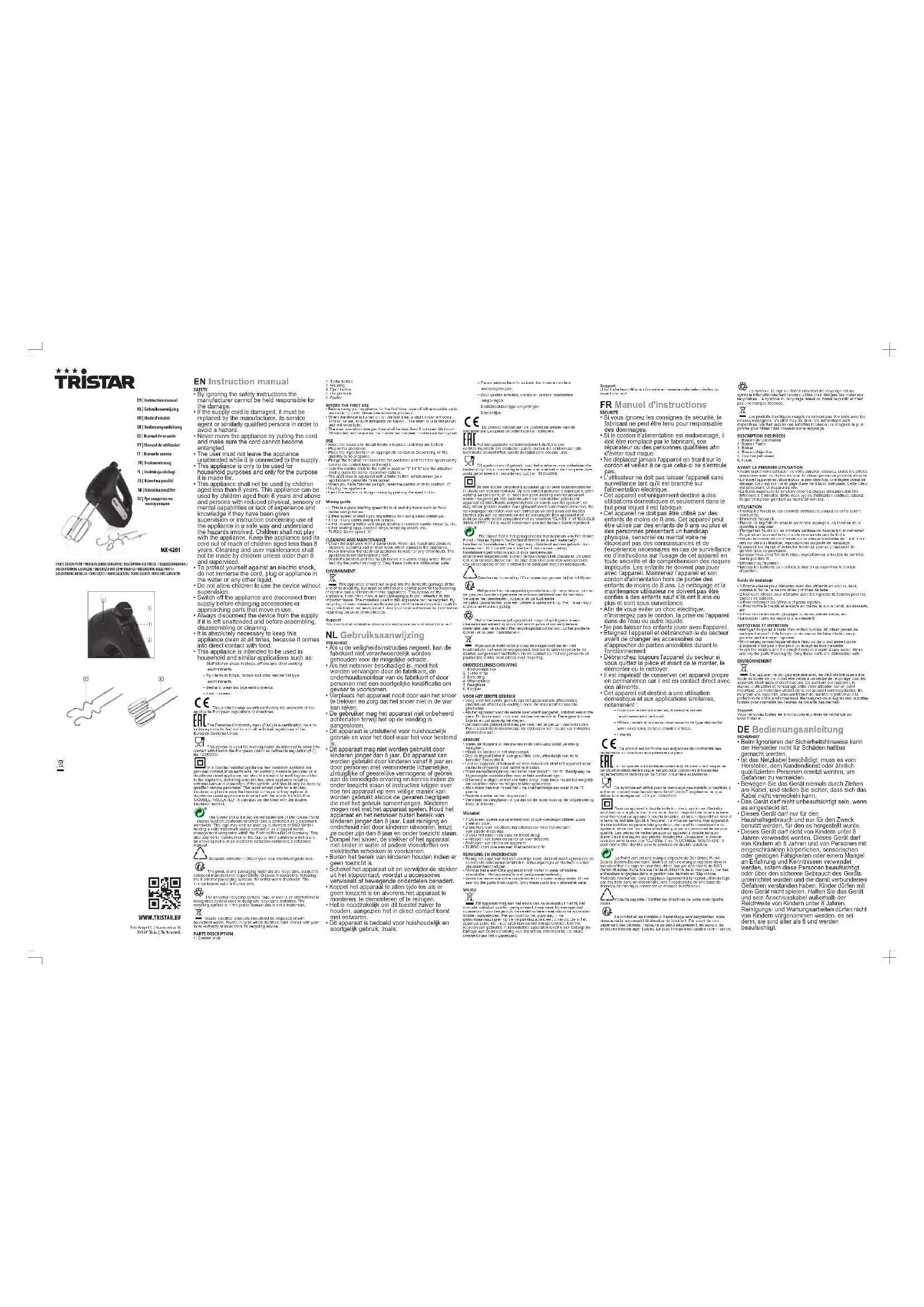 - 5 Pour battre les oeufs, glaçages cuisinés, crème battue, etc.• Le bouton Turbo correspond à la vitesse6.NETTOYAGE ET ENTRETIEN• Nettoyez l'appareil à l'aide d'un chiffon humide. N'utilisez jamais denettoyant abrasif ni de tampon à récurer ou de laine d'acier, ce quipourrait endommager l'appareil.• N'immergez jamais l'appareil dans l'eau ou dans tout autre liquide.L'appareil n'est pas prévu pour un lavage au lave-vaisselle.• Wash the beaters and the dough hooks in a warm soapy water. Rinseand dry the parts thouroughly. Only these parts are dishwasher safe.ENVIRONNEMENTCet appareil ne doit pas être jeté avec les déchets ménagers à lafin de sa durée de vie, il doit être remis à un centre de recyclage pour lesappareils électriques et électroniques. Ce symbole sur l'appareil, lemanuel d'utilisation et l'emballage attire votre attention sur un pointimportant. Les matériaux utilisés dans cet appareil sont recyclables. Enrecyclant vos appareils, vous contribuez de manière significative à laprotection de notre environnement. Renseignez-vous auprès des autoritéslocales pour connaître les centres de collecte des déchets.SupportVous retrouvez toutes les informations et pièces de rechange surwww.tristar.eu! DEBedienungsanleitung SICHERHEIT