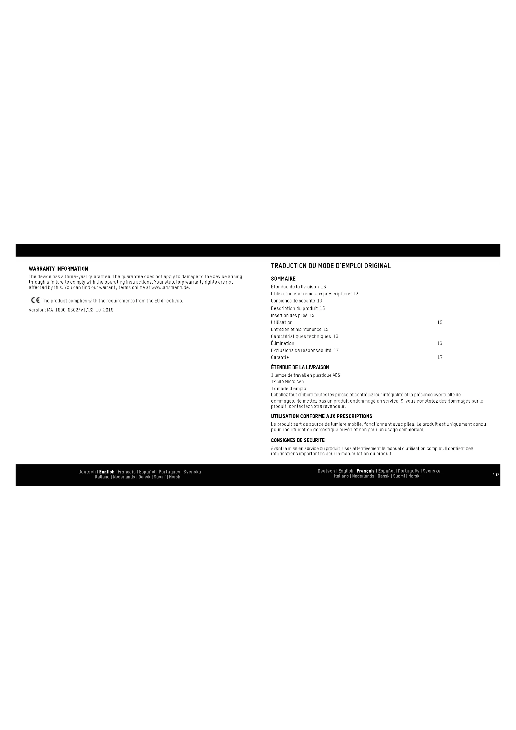 Les informations fournies dans ce mode d'emploi peuvent être modifiées sans notification préalable. ANSMANN n'endosse aucune responsabilité pour les dommages ou dommages conséquents directs, indirects, accidentels ou autre causés par la manipulation inappropriée ou par le non-respect des informations fournies dans ce mode d'emploi. En cas d'usage incorrect du produit, nous n'endossons aucune responsabilité et n'accordons aucun droit de garantie. GARANTIE Nous offrons une garantie de trois ans sur l'appareil. Aucune garantie n'est accordée en cas de dom- mages sur l'appareil causés par le non-respect du mode d'emploi. Cela n’affecte pas votre droit légal à la garantie. Vous trouverez nos conditions de garantie en ligne à l’adresse www.ansmann.de. Le produit est conforme aux exigences des directives européennes. Version: MA-1600-0302/V1/22-10-2019 Deutsch | English | Français | Español | Português | Svenska Italiano | Nederlands | Dansk | Suomi | Norsk ellement un peu de produit à vaisselle doux). N’utilisez en aucun cas de produit abrasif ou solvant pour le nettoyage. Maintenance Si vous n’utilisez pas le produit, retirez les piles et entreposez-les séparément pour conserver leur durée de vie. CARACTERISTIQUES TECHNIQUES Agent lumineux LED COB 1W Groupe de risque 1 Alimentation électrique 1x pile Micro AAA LR03 Classe de protection III Flux lumineux 40 lm Autonomie 4h30 min Matériau du boîtier ABS Indice de protection IP20 Température d’entreposage 5 à 25 °C Poids 42 g Dimensions de la lampe (H x L x P) 85 x 38 x 33.1 mm ÉLIMINATION Éliminez la lampe inutilisable conformément aux dispositions légales. Le marquage avec la « poubelle » indique que dans l’UE, les appareils électriques ne doivent pas être éliminés avec les déchets domestiques normaux. Utilisez les systèmes de retour et de collecte de votre commune ou adressez-vous au revendeur chez qui vous avez acheté le produit. Transmettez l’appareil à un point de collecte spécial pour appareils usagés en vue de son élimina- tion. Ne jetez pas l’appareil avec les déchets domestiques car il contient des piles / batteries. Vous vous acquittez ainsi de vos obligations légales et contribuez à la protection de l’environnement.19 18