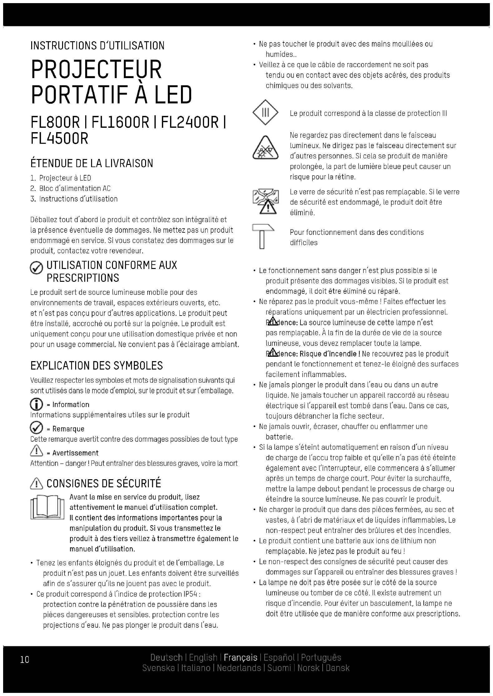 PRESCRIPTIONS Le produit sert de source lumineuse mobile pour des environnements de travail, espaces extérieurs ouverts, etc. et n’est pas conçu pour d’autres applications. Le produit peut être installé, accroché ou porté sur la poignée. Le produit est uniquement conçu pour une utilisation domestique privée et non pour un usage commercial. Ne convient pas à l’éclairage ambiant.