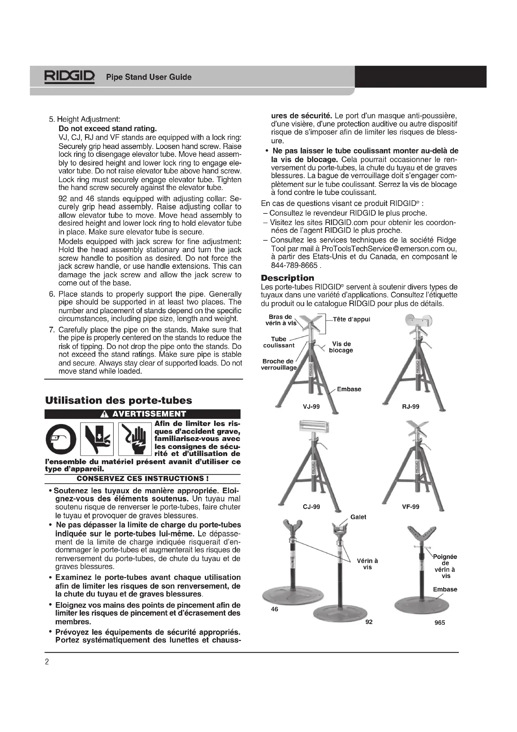 servent à soutenir divers types de tuyaux dans une variété d’applications. Consultez l’étiquette du produit ou le catalogue RIDGID pour plus de détails. VJ-99RJ-99CJ-99VF-99Vis de blocageEmbaseTête d’appuiTube coulissantBras de vérin à visBroche de verrouillage