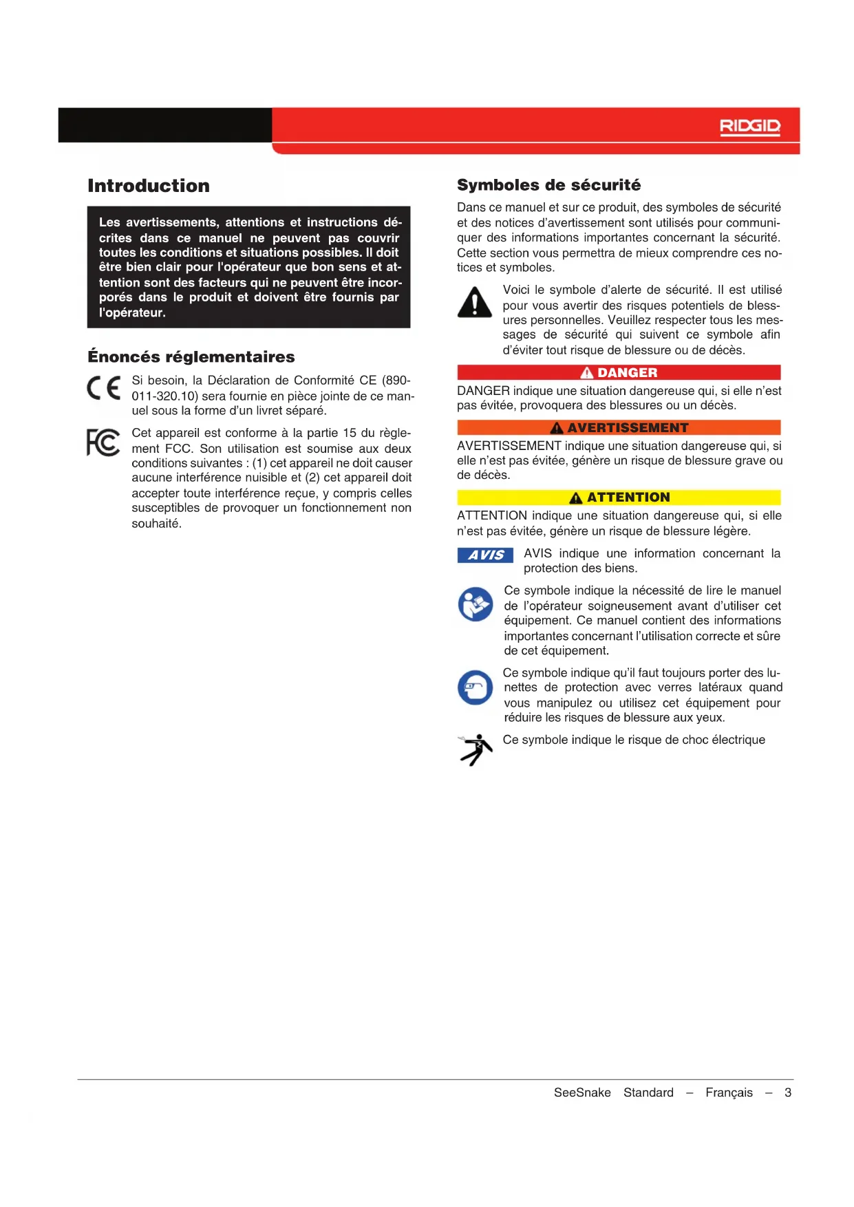 - Contact Ridge Tool Company Technical Service De- partment at rtctechservices@emerson.com or, in the USA and Canada, call 1-800-519-3456. Disposal Parts of your system contain valuable materials that can be recycled. There are companies that specialize in recy- cling that may be found locally. Dispose of the components in compliance with all applicable regulations. Contact your local waste management authority for more information. EC Countries: Do not dispose of electrical equipment with household waste! According to the European Guideline 2012/19/ EU for Waste Electrical and Electronic Equip- ment and its implementation into national legisla- tion, electrical equipment that is no longer usable must be collected separately and disposed of in an environmentally correct manner. Battery Disposal EC Countries: Defective or used batteries must be recycled according to the guideline 2006/66/EEC.Manuel de l’opérateur STANDARD Traduction des instructions d'origine – Français – 1 Pour toute assistance et informations sup- plémentaires concernant l'utilisation de votre See Snake Standard, rendez vous sur support.seesnake.com/fr/standard ou scannez ce code QR. AVERTISSEMENT ! Lire soigneusement ce Ma- nuel de l'opérateur avant d'utiliser cet appareil. Un manque de compréhension et un manque de respect du contenu de ce manuel peuvent causer un choc électrique, un incendie et/ou des blessures graves. Avec Technologie2 – Français – SeeSnake Standard Table des matières Introduction Énoncés réglementaires ..........................................................................................................................................3 Symboles de sécurité ..............................................................................................................................................3 Règles générales de sécurité Sécurité de l’aire de travail.......................................................................................................................................4 Sécurité électrique ..................................................................................................................................................4 Sécurité personnelle ...............................................................................................................................................4 Utilisation et entretien de l’équipement .....................................................................................................................5 Contrôle préalable ..................................................................................................................................................5 Vue d'ensemble du See Snake Standard Description ............................................................................................................................................................6 Caractéristiques techniques .....................................................................................................................................7 Équipement standard .............................................................................................................................................. 7 Pièces du système .................................................................................................................................................8 Informations de sécurité spécifiques Sécurité SeeSnake Standard ................................................................................................................................... 8 Montage Installation des roulettes .......................................................................................................................................... 9 Consignes d'utilisation Positionnement ......................................................................................................................................................9 Vue d'ensemble de l'inspection ..............................................................................................................................10 Guides de canalisation ..........................................................................................................................................10 Maintenance et assistance Nettoyage ............................................................................................................................................................10 Maintenance des pièces ........................................................................................................................................10 Rangement .......................................................................................................................................................... 10 Assistance ........................................................................................................................................................... 10 Entretien et réparation ........................................................................................................................................... 11 Mise au rebut ....................................................................................................................................................... 11SeeSnake Standard – Français – 3 Introduction Les avertissements, attentions et instructions dé- crites dans ce manuel ne peuvent pas couvrir toutes les conditions et situations possibles. Il doit être bien clair pour l'opérateur que bon sens et at- tention sont des facteurs qui ne peuvent être incor- porés dans le produit et doivent être fournis par l'opérateur. Énoncés réglementaires Si besoin, la Déclaration de Conformité CE (890- 011-320.10) sera fournie en pièce jointe de ce man- uel sous la forme d’un livret séparé. Cet appareil est conforme à la partie 15 du règle- ment FCC. Son utilisation est soumise aux deux 
