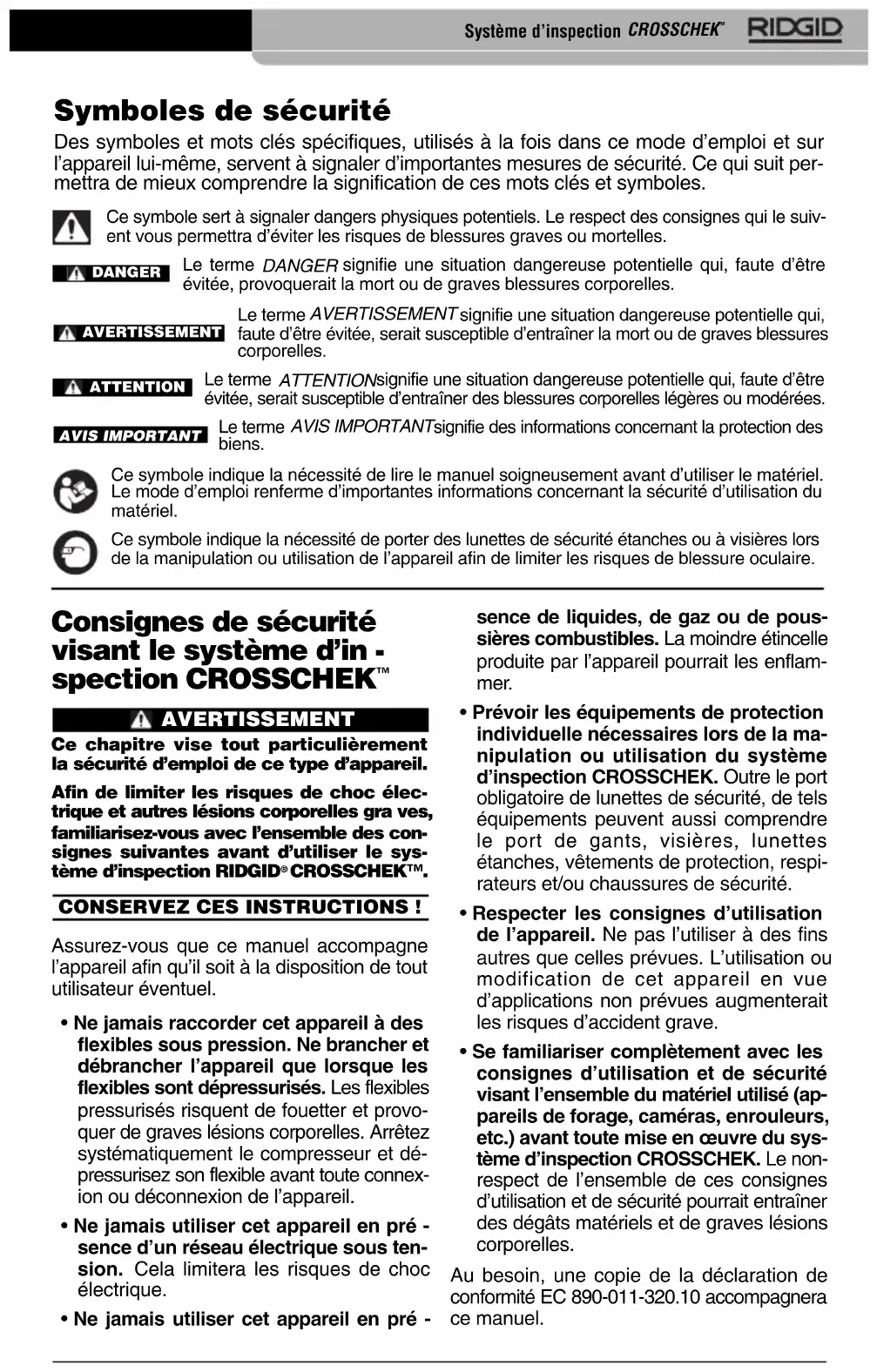 - Se familiariser complètement avec les consignes d’utilisation et de sécurité visant l’ensemble du matériel utilisé (ap- pareils de forage, caméras, enrouleurs, etc.) avant toute mise en œuvre du sys- tème d’inspection CROSSCHEK. Le non- respect de l’ensemble de ces consignes d’utilisation et de sécurité pourrait entraîner des dégâts matériels et de graves lésions corporelles. Au besoin, une copie de la déclaration de conformité EC 890-011-320.10 accompagnera ce manuel. Consignes de sécurité visant le système d’in - spection CROSSCHEK